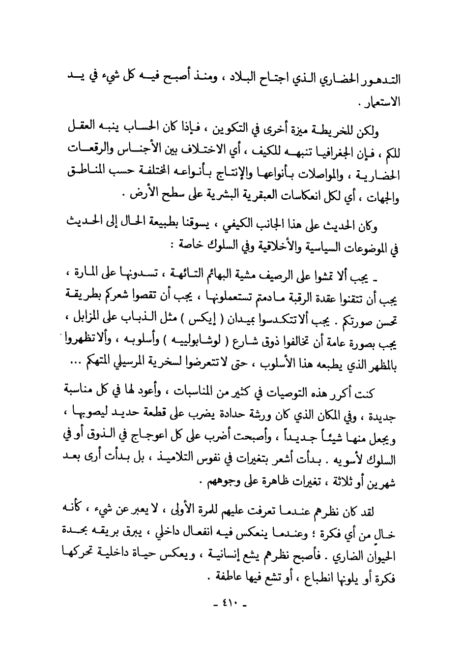 كنت أكرر هذه التوصيات في كثير من المناسبات، وأعود لها في كل مناسبة جديدة، وفي المكان الذي كان ورشة حدادة يضرب على قطعة حديد ليصوبها، ويجعل منها شيئاً جديداً، وأصبحت أضرب على كل اعوجاج في الذوق أو في السلوك لأسويه. بدأت أشعر بتغيرات في نفوس التلاميذ، بل بدأت أرى بعد شهرين أو ثلاثة، تغيرات ظاهرة على وجوههم.