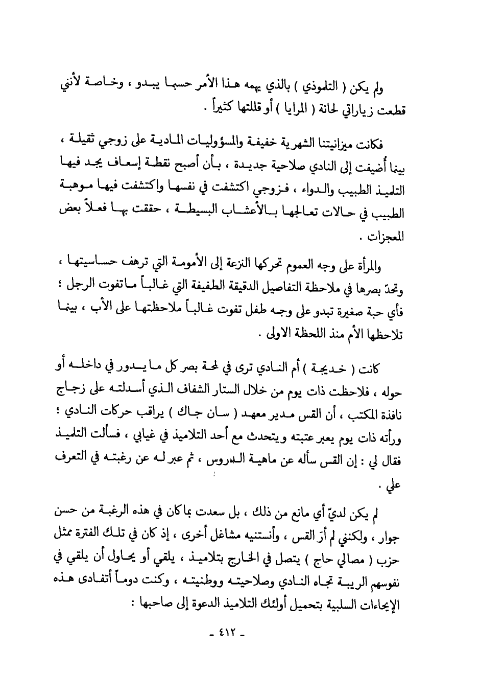 كانت (خديجة) أم النادي ترى في لمحة بصر كل ما يدور في داخله أو حوله، فلاحظت ذات يوم من خلال الستار الشفاف الذي أسدلته على زجاج نافذة المكتب، أن القس مدير معهد (سان جاك) يراقب حركات النادي؛ ورأته ذات يوم يعبر عتبته ويتحدث مع أحد التلاميذ في غيابي، فسألت التلميذ فقال لي: إن القس سأله عن ماهية الدروس، ثم عبر له عن رغبته في التعرف علي.