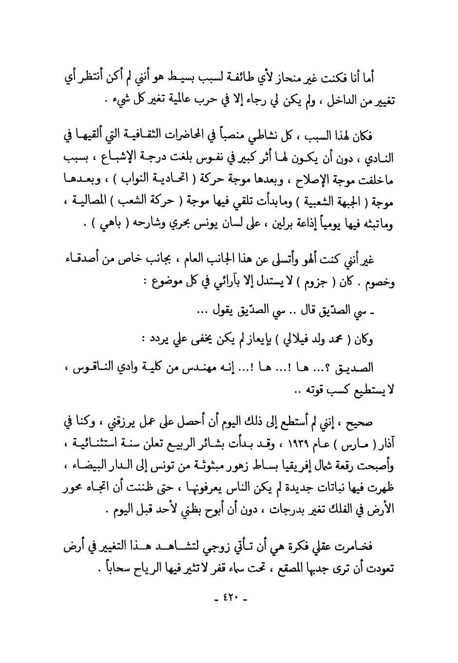 صحيح، إنني لم أستطع إلى ذلك اليوم أن أحصل على عمل يرزقني، وكنا في آذار (مارس) عام 1939، وقد بدأت بشائر الربيع تعلن سنة استثنائية، وأصبحت رقعة شمال إفريقيا بساط زهور مبثوثة من تونس إلى الدار البيضاء، ظهرت فيها نباتات جديدة لم يكن الناس يعرفونها، حتى ظننت أن اتجاه محور الأرض في الفلك تغير بدرجات، دون أن أبوح بظني لأحد قبل اليوم.