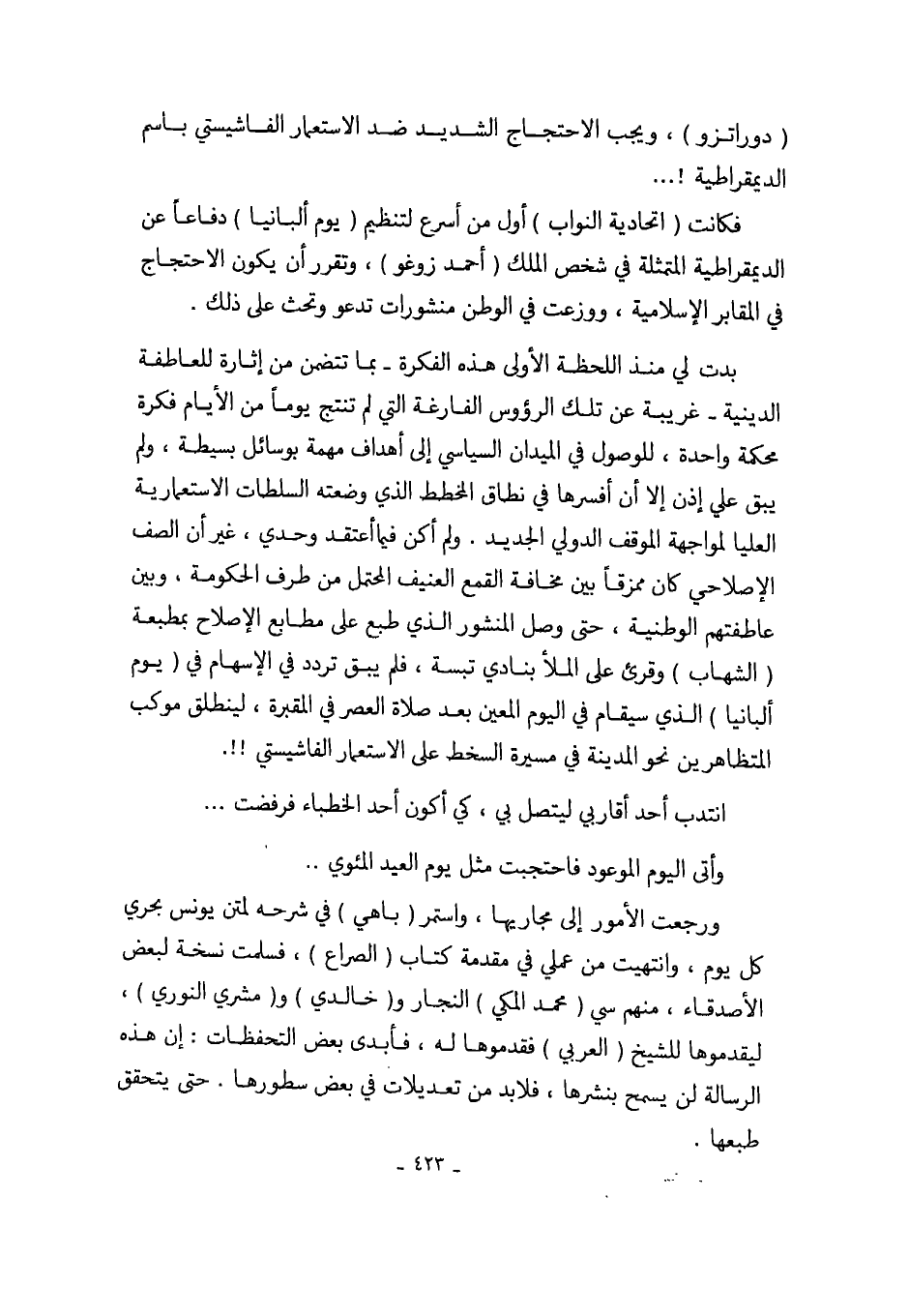 بدت لي مند اللحظة الأولى هذه الفكرة- بما تتضمن من إثارة للعاطفة الدينية- غريبة عن تلك الرؤوس الفارغة التي لم تنتج يوماً من الأيام فكرة محكمة واحدة، للوصول في الميدان السياسي إلى أهداف مهمة بوسائل بسيطة، ولم يبق علي إذن إلا أن أفسرها في نطاق المخطط الذي وضعته السلطات الاستعمارية العليا لمواجهة الموقف الدولي الجديد. ولم أكن فيما أعتقد وحدي، غير أن الصف الإصلاحي كان ممزقاً بين مخافة القمع العنيف المحتمل من طرف الحكومة، وبين عاطفتهم الوطنية، حتى وصل المنشور الذي طبع على مطابع الإصلاح بمطبعة (الشهاب) وقرئ على الملأ بنادي تبسة، فلم يبق تردد في الإسهام في (يوم ألبانيا) الذي سيقام في اليوم المعين بعد صلاة العصر في المقبرة، لينطلق موكب المتظاهرين نحو المدينة في مسيرة السخط على الاستعمار الفاشيستي!!.