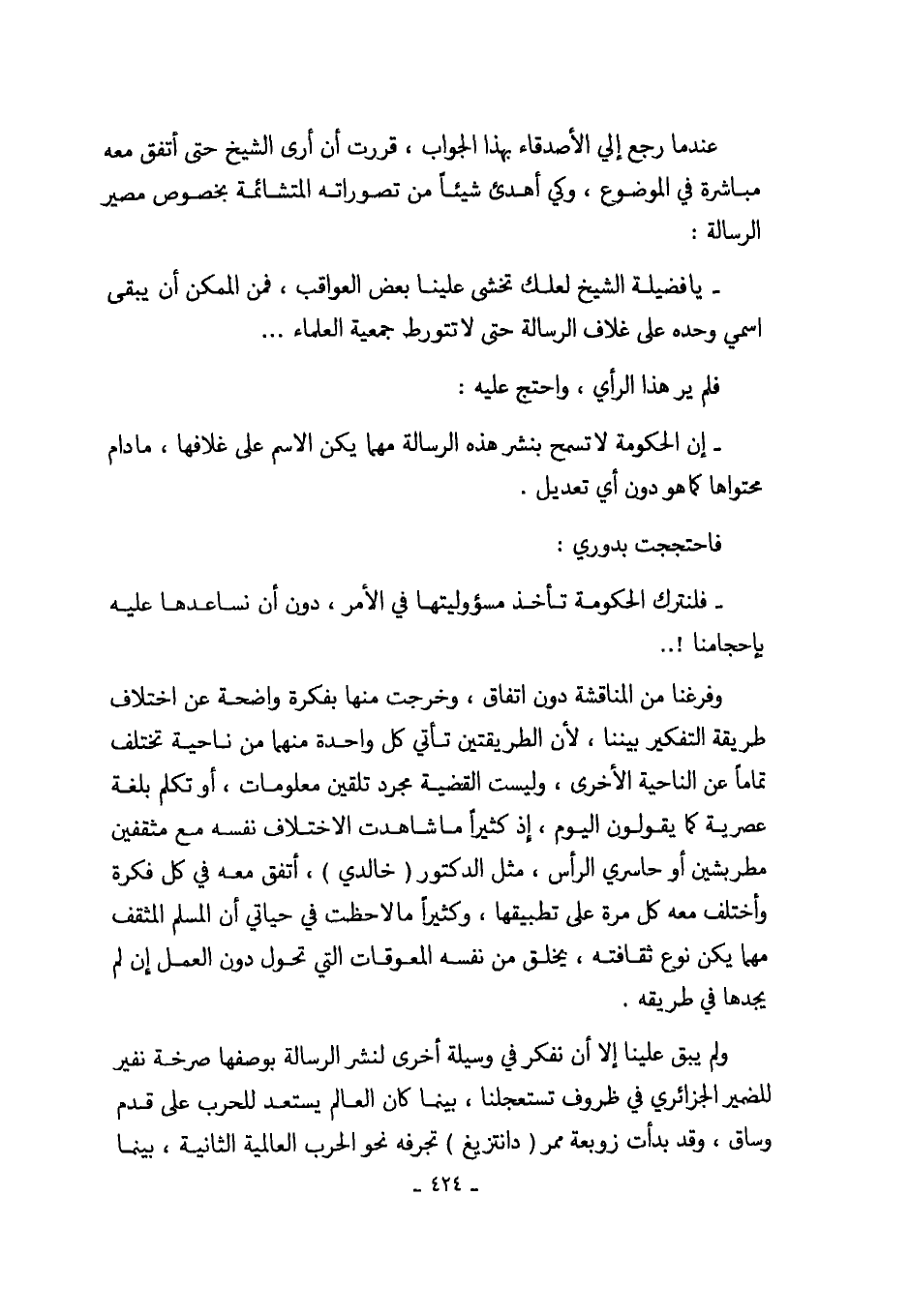 - يا فضيلة الشيخ لعلك تخشى علينا بعض العواقب، فمن الممكن أن يبقى اسمي وحده على غلاف الرسالة حتى لا تتورط جمعية العلماء ...