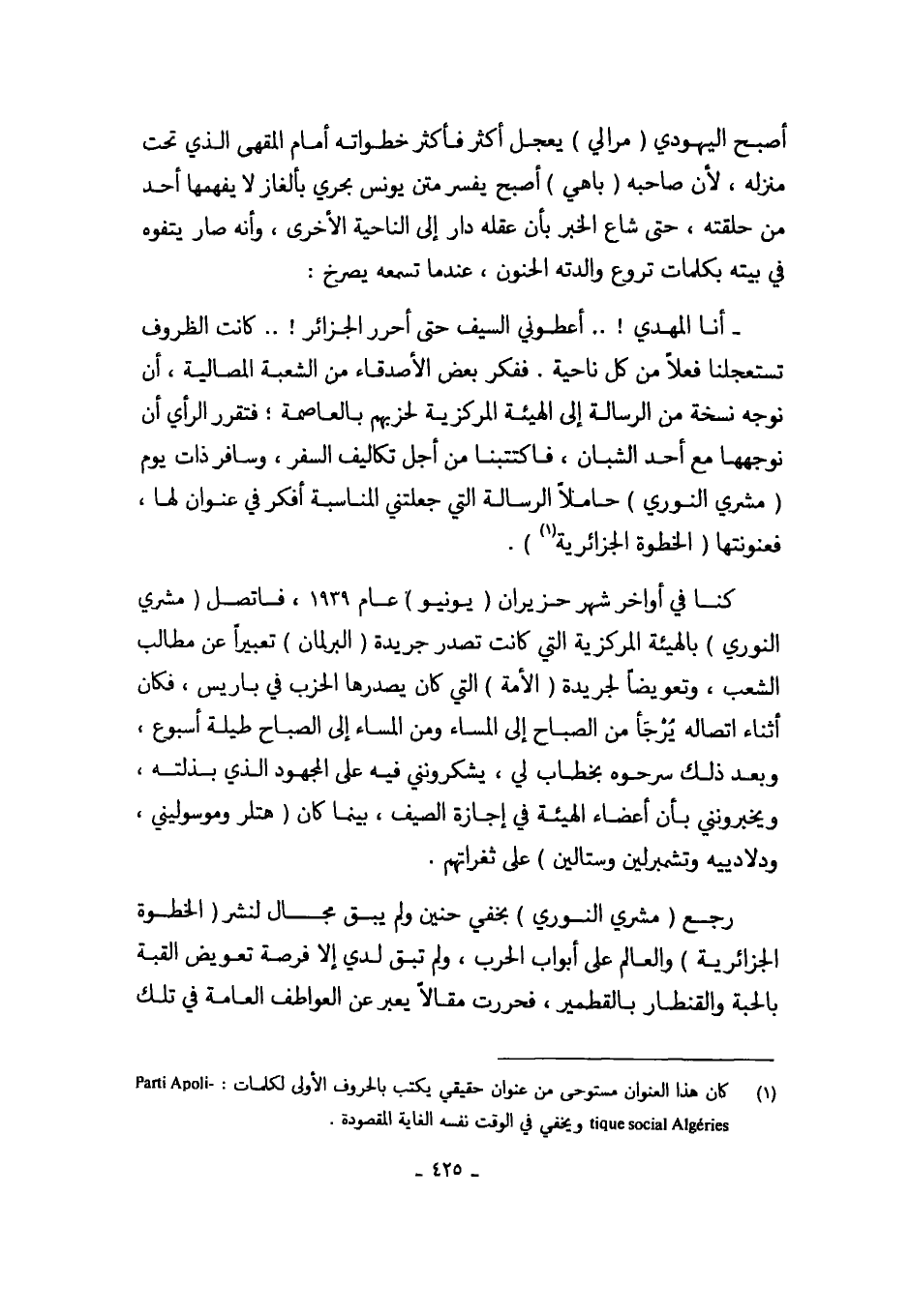 - أنا المهدي! .. أعطوني السيف حتى أحرر الجزائر! .. كانت الظروف تستعجلنا فعلاً من كل ناحية. ففكر بعض الأصدقاء من الشعبة المصالية، أن نوجه نسخة من الرسالة إلى الهيئة المركزية لحزبهم بالعاصمة؛ فتقرر الرأي أن نوججهها مع أحد الشبان، فاكتتبنا من أجل تكاليف السفر، وسافر ذات يوم (مشري النوري) حاملاً الرسالة التي جعلتني المناسبة أفكر في عنوان لها، فعنونتها (الخطوة الجزائرية (¬1)).