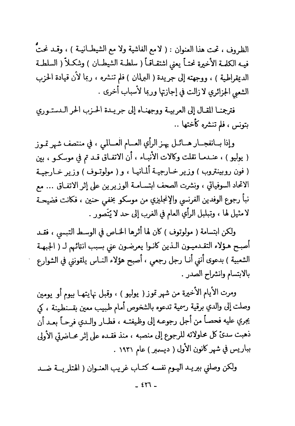 الظروف، تحت هذا العنوان: (لا مع الفاشية ولا مع الشيطانية)، وقد نحتُّ فيه الكلمة الأخيرة نحتاً يعني اشتقاقاً (سلطة الشيطان) وشكلاً (السلطة الديمقراطية)، ووجهته إلى جريدة (البرلمان) فلم تنشره، ربما لأن قيادة الحزب الشعبي الجزائري لا زالت في إجازتها وربما لأسباب أخرى.