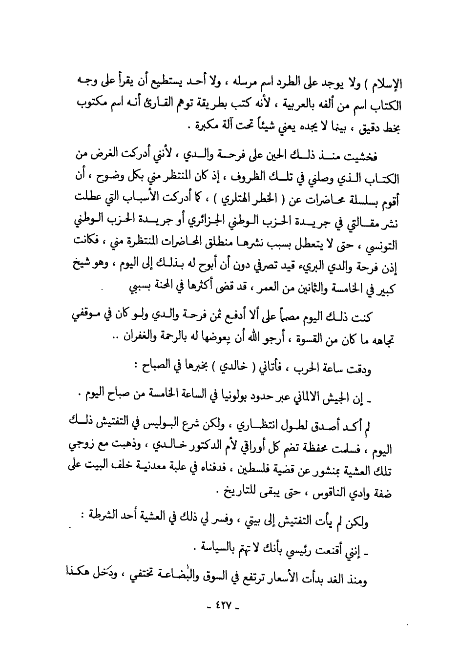فخشيت منذ ذلك الحين على فرحة والدي، لأنني أدركت الغرض من الكتاب الذي وصلني في تلك الظروف، إذ كان المنتظر مني بكل وضوح، أن أقوم بسلسلة محاضرات عن (الخطر الهتلري)، كما أدركت الأسباب التي عطلت نشر مقالتي في جريدة الحزب الوطني الجزائري أو جريدة الحزب الوطني التونسي، حتى لا يتعطل بسبب نشرها منطلق المحاضرات المنتظرة مني، فكانت إذن فرحة والدي البريء قيد تصرفي دون أن أبوح له بذلك إلى اليوم، وهو شيخ كبير في الخامسة والثمانين من العمر، قد قضى أكثرها في المحنة بسببي.