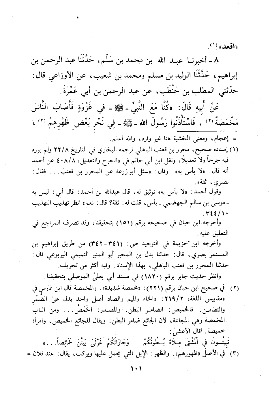 8 - أخبرنا عبد الله بن محمد بن سَلْم، حَدَّثَنَا عبد الرحمن بن إبراهيم، حَدّثَنَا الوليد بن مسلم ومحمد بن شعيب، عن الأوزاعي قال: حدّثني المطلب بن حَنْطَب، عن عبد الرحمن بن أبي عَمْرَةَ.