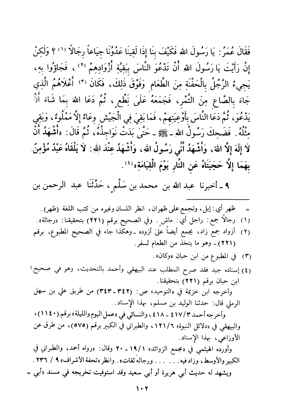 فَقَالَ عُمَرُ: يَا رَسُولَ اللهِ فَكَيْفَ بِنَا إِذَا لَقِينَا عَدُوَّنَا جِيَاعاً رِجَالاَ (¬1)؟ وَلكِنْ إِنْ رَأَيْتَ يَا رَسُولَ اللهِ أن تَدْعُوَ النَّاسَ بِبَقِيَّةِ أَزوَادِهِمْ (¬2)، فَجَاؤُوا بِهِ، يَجِيءُ الرَّجُلُ بِالْحَفْنَةِ مِنَ الطَّعَامِ وَفَوْقَ ذلِكَ، فَكَانَ (¬3) أَعْلَاهُمُ الَّذِي جَاءَ بِالصَّاعِ مِنَ التَّمْرِ، فَجَمَعَهُ عَلَى نَطْعٍ، ثُمَّ دَعَا اللهَ بِمَا شَاءَ أَن يَدْعُوَ، ثُمَّ دَعَا النَّاسَ بأَوْعِيَتِهِمْ، فَمَا بَقِيَ فِي الْجَيْشِ وِعَاءٌ إِلّاَ مَمْلُوءٌ، وَبَقِي مِثْلُهُ. فَضَحِكَ رَسُولُ اللهِ - صلى الله عليه وسلم - حَتَّى بَدَتْ نَوَاجِذُهُ، ثُمَّ قَالَ: "أشْهَدُ أنْ لا إِلهَ إِلا الله، وَأَشْهَدُ أَنِّي رَسُولُ اللهِ، وَأشْهَدُ عِنْدَ اللهِ: لا يَلْقَاهُ عَبْدٌ مُؤْمِنٌ. بِهَمَا إِلا حَجَبَتَاهُ عَنِ النَّارِ يَوْمَ الْقِيَامَةِ" (¬4).