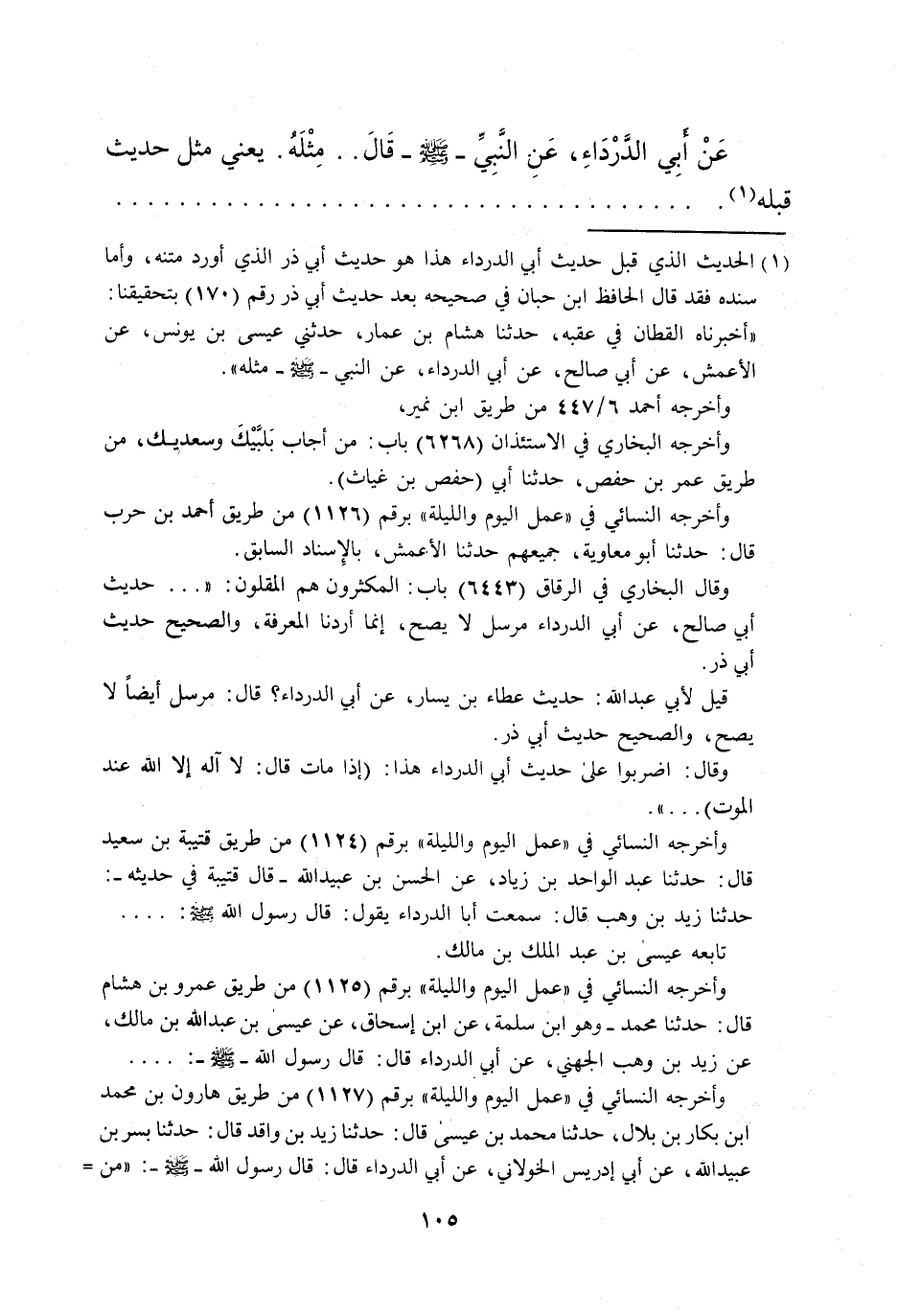 (¬1) الحديث الذي قبل حديث أبي الدرداء هذا هو حديث أبي ذر الذي أورد متنه، وأما سنده فقد قال الحافظ ابن حبان في صحيحه بعد حديث أبي ذر رقم (170) بتحقيقنا: "أخبرناه القطان في عقبه، حدثنا هشام بن عمار، حدثني عيسى بن يونس، عن الأعمش، عن أبي صالح، عن أبي الدرداء، عن النبي - صلى الله عليه وسلم - مثله".