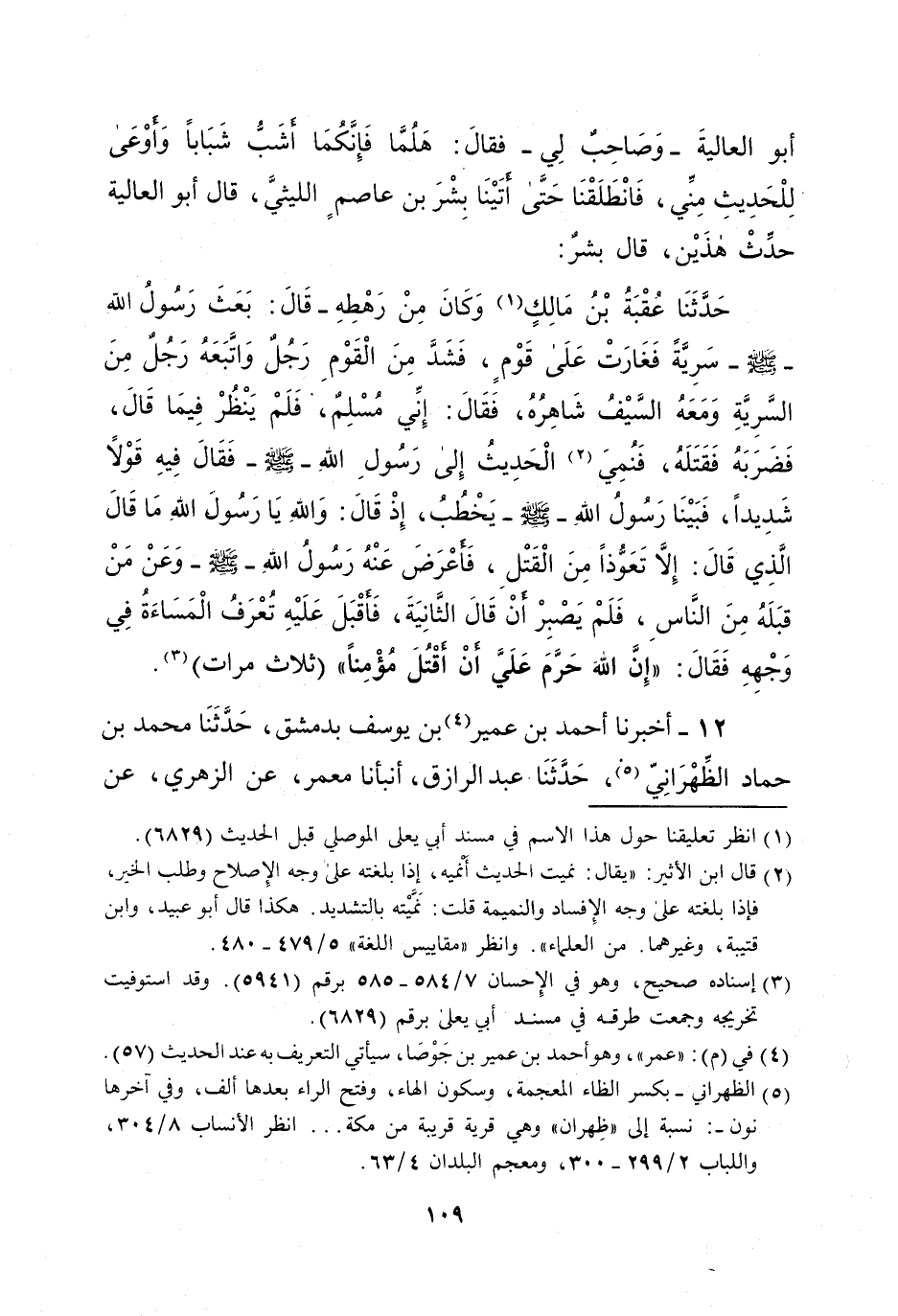 حَدَّثَنَا عْقْبَةُ بْنُ مَالِكٍ (¬1) وَكَانَ مِنْ رَهْطِهِ- قَالَ: بَعَثَ رَسُولُ الله - صلى الله عليه وسلم- سَرِيَّةً فَغَارَتْ عَلَى قَوْمٍ، فَشَدَّ مِنَ الْقَوْم رَجُلٌ وَاتَّبَعَهُ رَجُلٌ مِنَ السَّرِيَّةِ وَمَعَهُ السَّيْفُ شَاهِرُهُ، فَقَالَ: إِنِّي مُسْلِمٌ، فَلَمْ يَنْظُرْ فِيمَا قَالَ، فَضَرَبَهُ فَقَتَلَهُ، فَنُمِيَ (¬2) الْحَدِيثُ إِلى رَسُولِ اللهِ - صلى الله عليه وسلم - فَقَالَ فِيهِ قَوْلا شَدِيداً، فَبَيْنَا رَسُولُ الله - صلى الله عليه وسلم - يَخْطُبُ، إِذْ قَالَ: وَاللهِ يَا رَسُول اللهِ مَا قَالَ الَّذِي قَالَ: إِلا تَعَوُّذاً مِنَ الْقَتْلِ، فَأعْرَضَ عَنْهُ رَسُولُ اللهِ-صلى الله عليه وسلم -وَعَنْ مَنْ قبَلَهُ مِنَ النَّاسِ، فَلَمْ يَصْبِرْ أنْ قَالَ الثَانِيَةَ، فَأقْبَلَ عَلَيْهِ تُعْرَفُ الْمَسَاءَةُ فِي وَجْهِهِ فَقَالَ: "إِنَّ اللهَ حَرَّمَ عَلَيَّ أنْ أقْتُلَ مُؤْمِناً" (ثلاث مرات) (¬3).
