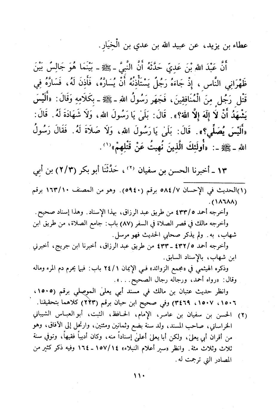 أنَّ عَبْدَ اللهِ بْنَ عَدِيّ حَدَّثَهُ أَنً النَبيَّ - صلى الله عليه وسلم - بَيْنَمَا هُوَ جَالِسٌ بَيْنَ ظَهْرَانِي النَّاسِ، إِذْ جَاءَهُ رَجُلٌ يَسْتَأْذِنُهُ أنْ يُسَارَّهُ، فَأَذِنَ لَهُ، فَسَارَّهُ فِي قَتْلِ رَجلٍ مِنَ الْمُنَافِقِينَ، فَجَهَر رَسُولُ اللهِ - صلى الله عليه وسلم - بِكَلامِهِ وَقَالَ: "أَلَيْسَ يَشْهَدُ أنْ لا إِلهَ إِلأ الله؟ ". قَالَ: بَلَى يَا رَسُولَ الله، وَلا شَهَادَةَ لَهُ. قَالَ: "ألَيْسَ يصَلِّي؟ "- قَال: بَلَى يَا رَسُولَ اللهِ، وَلَا صَلَاةَ لَهُ. فَقَالَ رَسُولُ الله - صلى الله عليه وسلم -: "أولَئِكَ الَّذِينَ نُهِيتُ عَنْ قَتْلِهِمْ" (¬1).