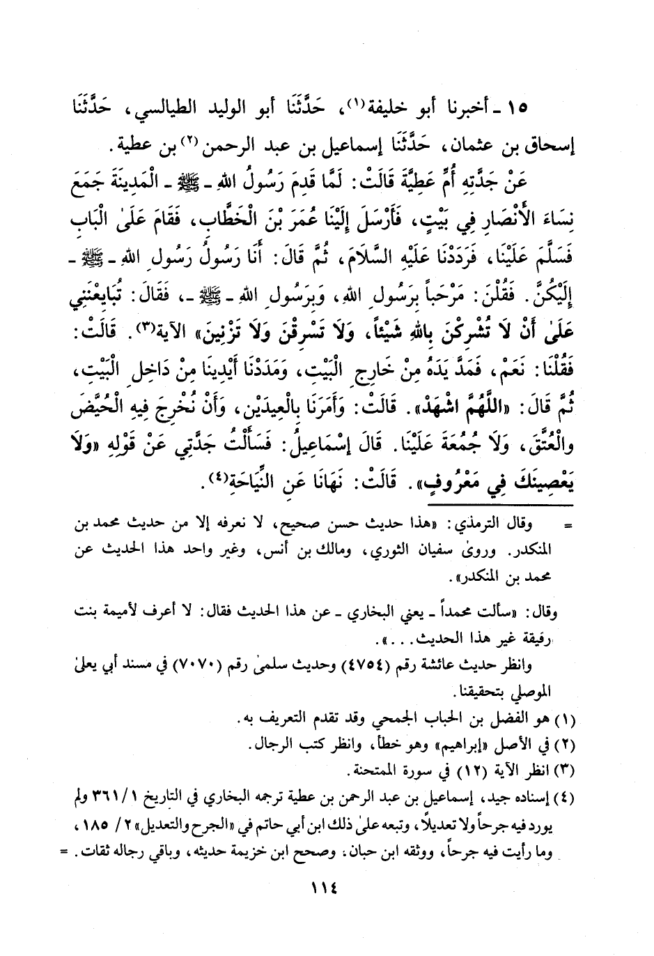 =وقال الترمذي: "هذا حديث حسن صحيح، لا نعرفه إلا من حديث محمد بن المنكدر. وروى سفيان الثوري، ومالك بن أنس، وغير واحد هذا الحديث عن محمد بن المنكدر". وقال: "سألت محمداً -يعني البخاري- عن هذا الحديث فقال: لا أعرف لأميمة بنت رقيقة غير هذا الحديث ... ". وانظر حديث عائشة رقم (4754) وحديث سلمى رقم (7070) في مسند أبي يعلى الموصلي بتحقيقنا.