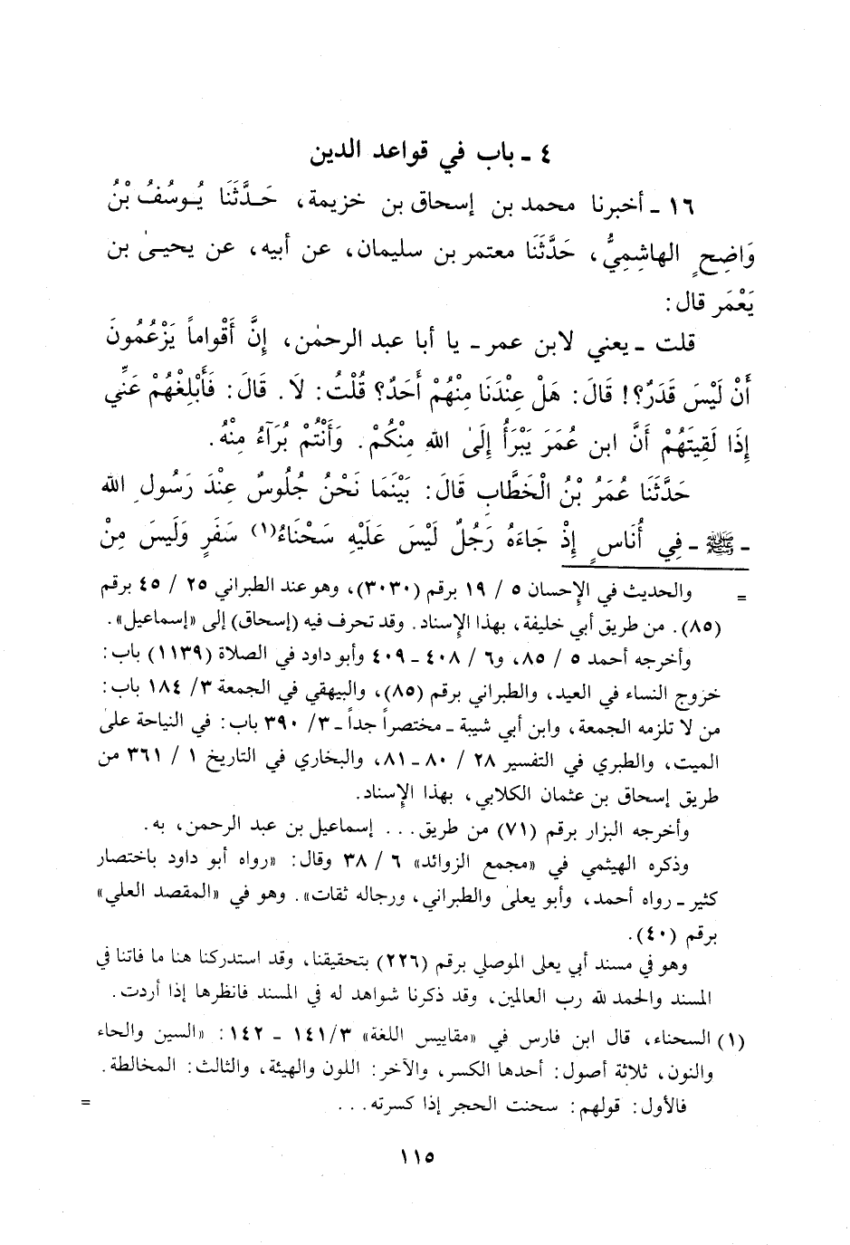 16 - أخبرنا محمد بن إسحاق بن خزيمة، حَدَّثَنَا يُوسُفُ بْنُ وَاضِحٍ الهاشِمِيُّ، حَدَّثَنَا معتمر بن سليمان، عن أبيه، عن يحيى بن يَعْمَر قال: قلت -يعني لابن عمر- يا أبا عبد الرحمن، إِنَّ أَقْواماً يَزْعُمُونَ أنْ لَيْسَ قَدَرٌ؟! قَالَ: هَلْ عِنْدَنَا مِنْهُمْ أَحَدٌ؟ قُلْتُ: لا. قَالَ: فَأَبْلِغْهُمْ عَنِّي إِذَا لَقِيتَهُمْ أَنَّ ابن عُمَرَ يَبْرَأُ إِلَى الله مِنْكُمْ. وَأَنْتُمْ بُرَآءُ مِنْهُ. حَدَّثَنَا عُمَرُ بْنُ الْخَطَابِ قَالَ: بَيْنَمَا نَحْنُ جُلُوسٌ عِنْدَ رَسُولِ الله - صلى الله عليه وسلم - فِي أُنَاسٍ إِذْ جَاءَهُ رَجُلٌ لَيْسَ عَلَيْهِ سحْنَاءُ (¬1) سَفَرٍ وَلَيسَ من