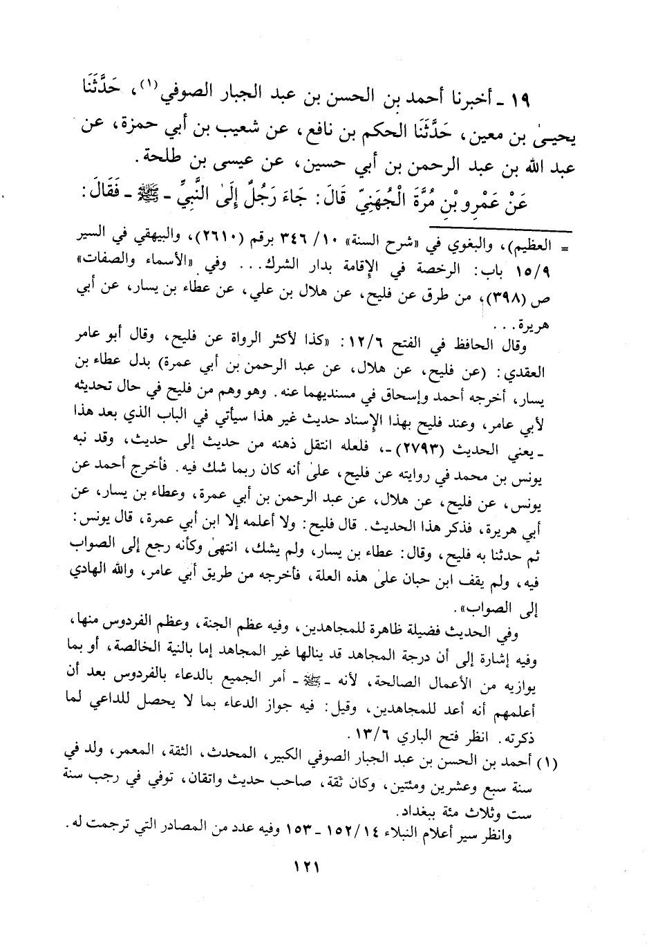 وقال الحافظ في الفتح 6/ 12: "كذا لأكثر الرواة عن فليح، وقال أبو عامر العقدي: (عن فليح، عن هلال، عن عبد الرحمن بن أبي عمرة) بدل عطاء بن يسار، أخرجه أحمد وإسحاق في مسنديهما عنه. وهو وهم من فليح في حال تحديثه لأبي عامر، وعند فليح بهذا الإِسناد حديث غير هذا سيأتي في الباب الذي بعد هذا -يعني الحديث (2793) -، فلعله انتقل ذهنه من حديث إلى حديث، وقد نبه يونس بن محمد في روايته عن فليح، على أنه كان ربما شك فيه. فأخرج أحمد عن يونس، عن فليح، عن هلال، عن عبد الرحمن بن أبي عمرة، وعطاء بن يسار، عن أبي هريرة، فذكر هذا الحديث. قال فليح: ولا أعلمه إلا ابن أبي عمرة، قال يونس: ثم حدثنا به فليح، وقال: عطاء بن يسار، ولم يشك، انتهى وكأنه رجع إلى الصواب فيه، ولم يقف ابن حبان على هذه العلة، فأخرجه من طريق أبي عامر، والله الهادي إلى الصواب". وفي الحديث فضيلة ظاهرة للمجاهدين، وفيه عظم الجنة، وعظم الفردوس منها، وفيه إشارة إلى أن درجة المجاهد قد ينالها غير المجاهد إما بالنية الخالصة، أو بما يوازيه مم الأعمال الصالحة، لأنه-صلى الله عليه وسلم - أمر الجميع بالدعاء بالفردوس بعد أن أعلمهم أنه أعد للمجاهدين، وقيل: فيه جواز الدعاء بما لا يحصل للداعي لما ذكرته. انظر فتح البارقي 6/ 13.