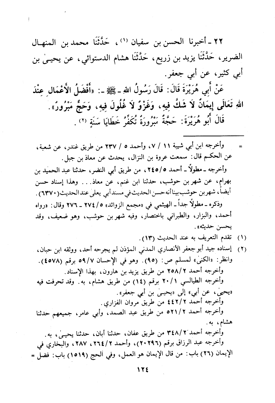 عن أبِي هُرَيْرةَ قَالَ: قَالَ رَسُولُ اللهِ - صلى الله عليه وسلم -: "أفْضَلُ الأَعْمَالِ عِنْدَ الله تعالى إِيمَانٌ لا شَكَّ فِيهِ، وَغَزْوٌ لا غُلُولَ فِيهِ، وَحَجٌ مَبْرُورٌ". ابُو هُرَيْرَةَ: حَجَّةٌ مَبْرُورَةٌ تُكَفِّرُ خَطَايَا سَنَةٍ (¬2).
