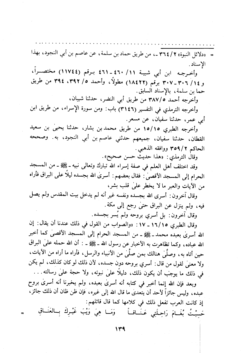وقال الطبري 15/ 16 - 17: "والصواب من القول في ذلك عندنا أن يقال: إن الله أسرى بعبده محمد - صلى الله عليه وسلم - من المسجد الحرام إلى المسجد الأقصى كما أخبر الله عباده، وكما تظاهرت به الأخبار عن رسول الله - صلى الله عليه وسلم -: أن الله حمله على البراق حين أتاه به، وصلَّى هنالك بمن صلَّى من الأنبياء والرسل، فأراه ما أراه من الآيات، ولا معنى لقول من قال: أسري بروحه دون جسده، لأن ذلك لو كان كذلك، لم يكن في ذلك ما يوجب أن يكون ذلك، دليلا على نبوته، ولا حجة على رسالته ... وبعد فإن الله إِنما أخبر في كتابه أنه أسرى بعبده، ولم يخبرنا أنه أسرى بروح عبده، وليس جائزاً لأحد أن يتعدى ما قال الله إلى غيره، فإن ظن ظان أن ذلك جائز، إذ كانت العرب تفعل ذلك في كلامها كما قال قائلهم: