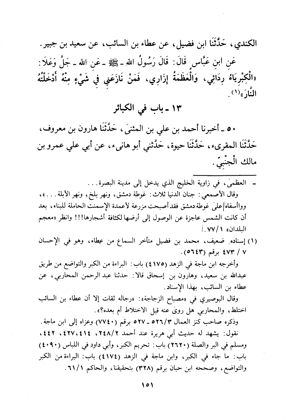 عَنِ ابنِ عَبَّاس قَالَ: قَالَ رَسُولُ اللهِ - صلى الله عليه وسلم - عَنِ الله -جَلَّ وَعَلا: "الْكِبْرِيَاءُ رِدَائِي، وَالْعَظَمَةُ إِزَارِي، فَمَنْ نَازَعَنِي فِي شَيْءٍ مِنْهُ أدْخَلْتُهُ النَارَ" (¬1).