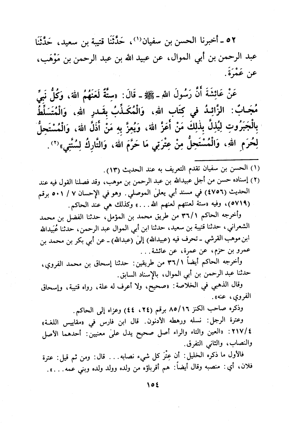 52 - أخبرنا الحسن بن سفيان (¬1)، حَدَّثَنَا قتيبة بن سعيد، حَدَّثَنَا عبد الرحمن بن أبي الموال، عن عبيد الله بن عبد الرحمن بن مَوْهَب، عن عَمْرَةَ.