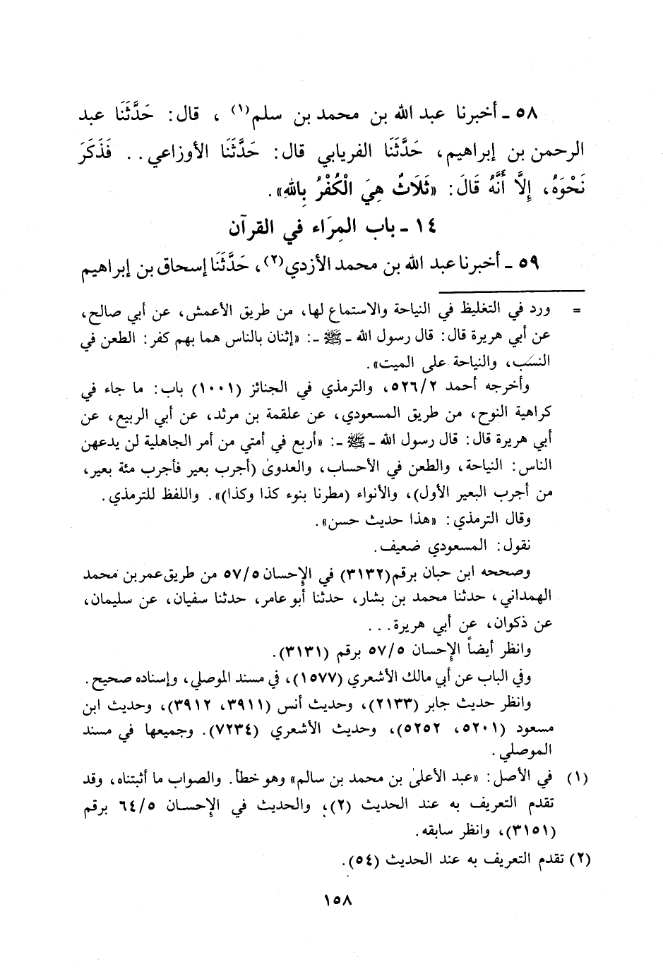 58 - أخبرنا عبد الله بن محمد بن سلم (¬1)، قال: حَدَّثَنَا عبد الرحمن بن إبراهيم، حَدّثَنَا الفريابي قال: حَدّثَنَا الأوزاعي .. فَذَكَرَ نَحْوَهُ، إِلأ أنَّهُ قَالَ: "ثَلاثٌ هِيَ الْكُفْرُ بِاللهِ".