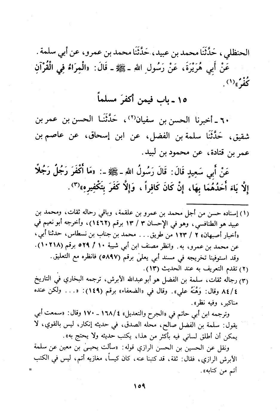 60 - أخبرنا الحسن بن سفيان (¬2)، حَدّثَنَا الحسن بن عمر بن شقيق، حَدّثَنَا سلمة بن الفضل، عن ابن إسحاق، عن عاصم بن عمر بن قتادة، عن محمود بن لبيد. عَنْ أَبِي سَعِيدٍ قَالَ: قَالَ رَسُولُ اللهِ - صلى الله عليه وسلم -: "مَا أكْفَرَ رَجُلٌ رَجلاً إِلاَّ بَاءَ أحَدُهُمَا بِهَا، إِنْ كَانَ كَافِراً، وَإِلاَّ كَفَرَ بِتَكْفِيرِهِ" (¬3).