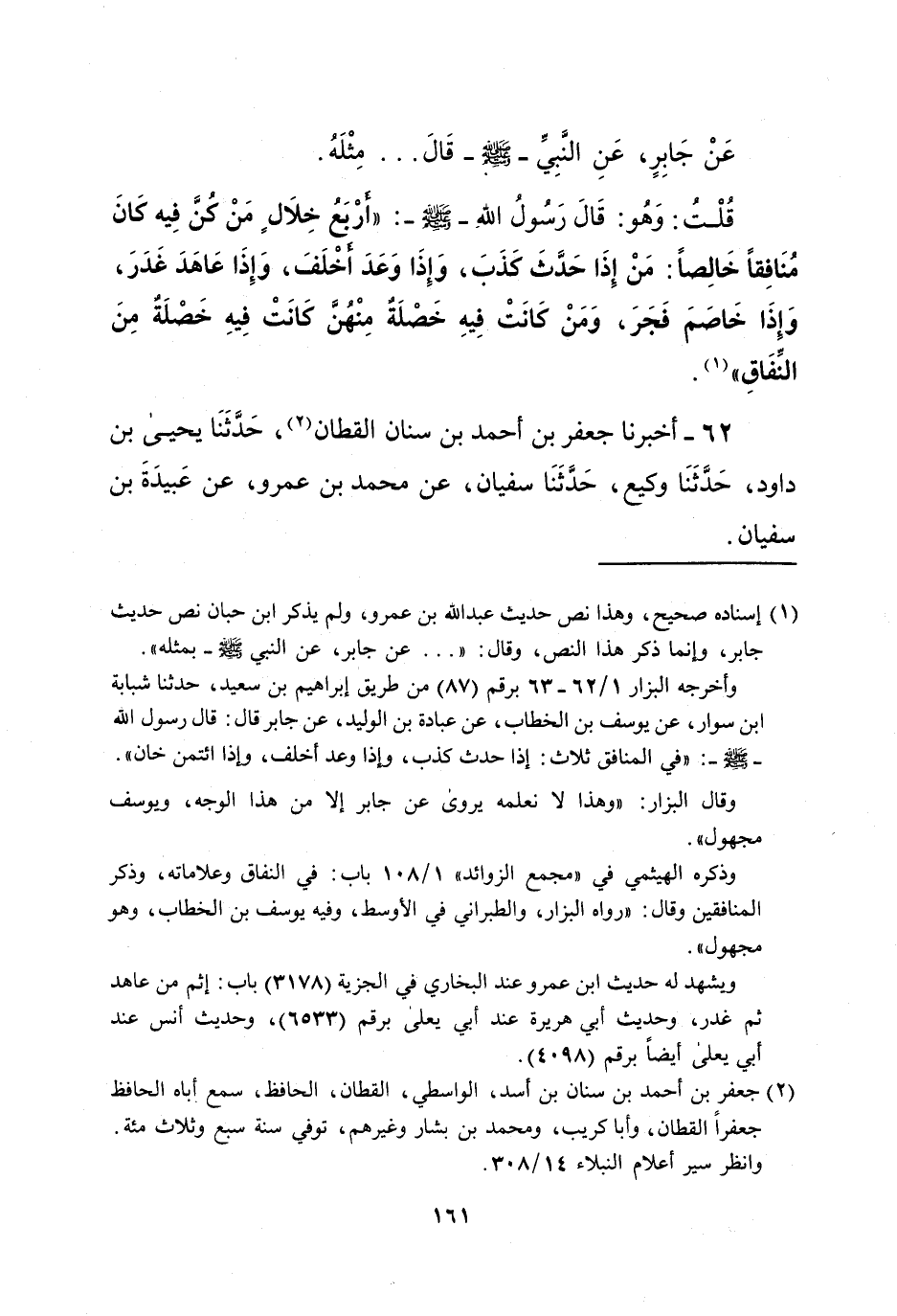 قُلْتُ: وَهُو: قَالَ رَسُولُ الله - صلى الله عليه وسلم -: "أرْبَعُ خِلَالٍ مَنْ كُنَّ فِيه كانَ مُنَافِقاً خَالِصاً: مَنْ إِذَا حَدَّثَ كَذَبَ، وَإِذَا وَعَدَ أخْلَفَ، وَإِذَا عَاهَدَ غَدَرَ، وَإِذَا خَاصمَ فَجَرَ، وَمَنْ كانَتْ فِيهِ خَصْلَةٌ مِنْهُنَّ كانَتْ فِيهِ خَصْلَةٌ مِنَ النِّفَاقِ" (¬1).