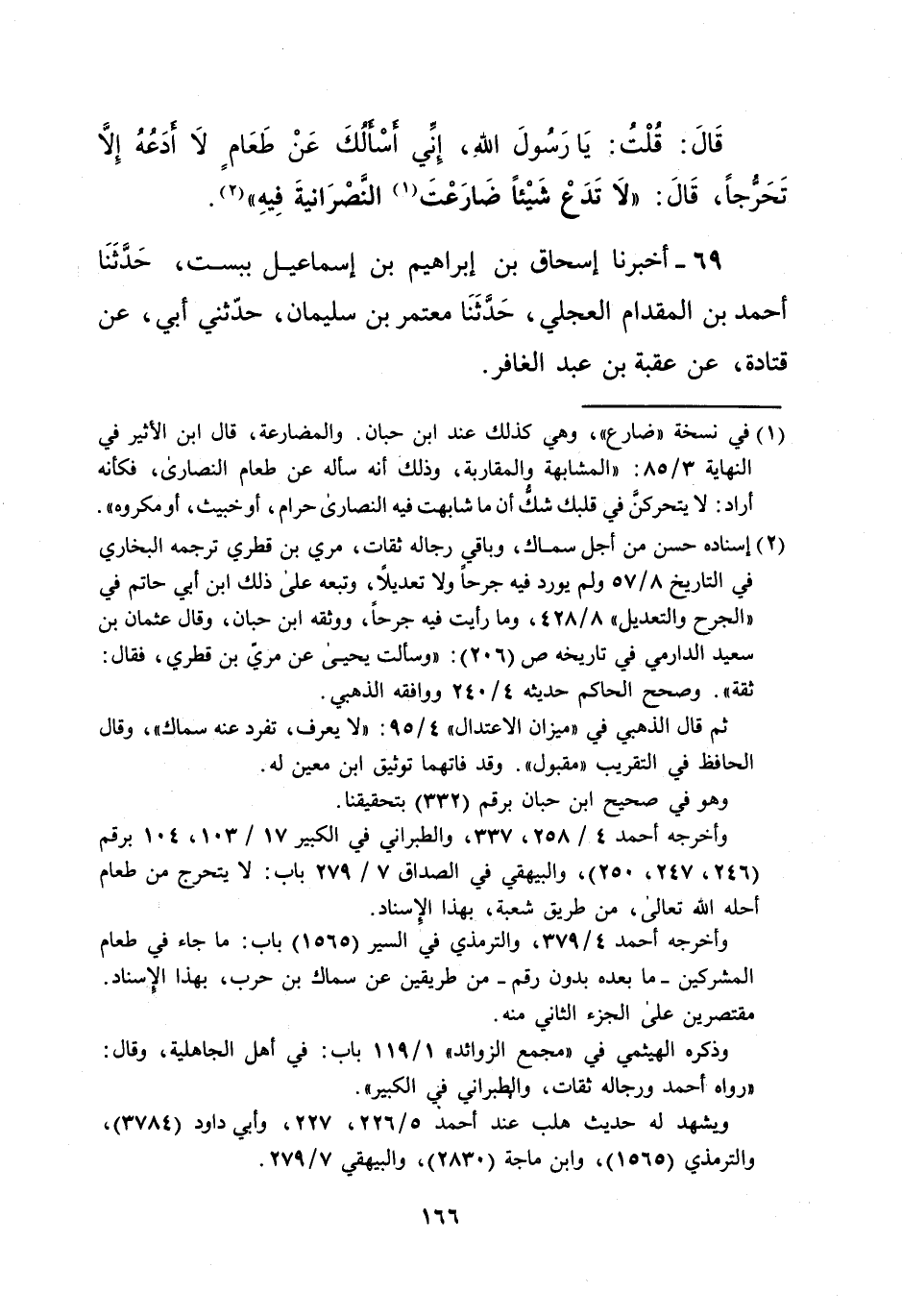 قَالَ: قُلْتُ:- يَا رَسُولَ اللهِ، إِنِّي أسْألُكَ عَنْ طَعَامٍ لا أدَعُهُ إِلاَ تَحَرُّجاً، قَالَ: "لا تَدَعْ شَيْئاً ضَارَعْتَ (¬1) النصْرَانيةَ فِيهِ" (¬2).