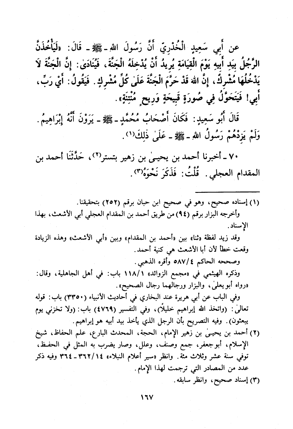عن أبِي سَعِيدٍ الْخُدْرِيّ أنَ رَسُولَ اللهِ - صلى الله عليه وسلم - قَالَ: "لَيَاخُذَنَّ الرجل بِيَدِ أبيهِ يَوْمَ الْقِيَامَةِ يُرِيدُ أنْ يُدْخِلَهُ الْجَنَّةَ، فَيُنَادَى: إِن الْجَنَّةَ لا يَدْخُلُهَا مُشْرِك، إن اللهَ قَدْ حَرَّمَ الْجَنَّةَ عَلَى كُل مشرك. فَيَقُولُ: أيْ رَبِّ، أبِي! فَيَتَحَوَّلُ فِي صُورَةٍ قَبِيحَةٍ وَرِيحٍ مُنْتِنَةٍ".