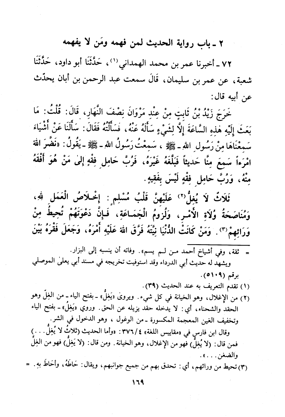 خَرَجَ زَيْدُ بْنُ ثَابِتٍ مِنْ عِنْدِ مَرْوَانَ نِصْفَ النَّهَارِ، قَالَ: قُلْتُ: مَا بَعَثَ إِلَيْهِ هذِهِ السَّاعَةَ إِلا لِشَيْءٍ سَألَهُ عَنْهُ، قسَالْتُهُ فَقَالَ: سَألَنَا عَنْ أشْيَاءَ سَمِعْنَاهَا مِنْ رَسُولِ اللهِ - صلى الله عليه وسلم -، سَمِعْتُ رَسُولُ اللهِ - صلى الله عليه وسلم يَقُولُ: "نَضَّرَ اللهُ امْرَءاً سَمعَ مِنَّا حَديثاً فَبَلَّغَهُ غَيْرَهُ، فرب حَامِلِ فِقْهٍ إِلى مَنْ هُوَ أَفْقَهُ مِنْهُ، وَرُبَّ حَامِلِ فِقْهٍ لَيْسَ بِفَقِيهٍ. ثَلَاثٌ لا يُغِلُّ (¬2) عَلَيْهِنَّ قَلْبُ مُسْلِمٍ: إِخْلاصُ الْعَمَلِ لِلّهِ، وَمُنَاصَحَةُ وُلاةِ الأمْرِ، وَلُزومُ الْجَمَاعَةِ، فَإِنَّ دَعْوَتَهُمْ تُحِيطُ مِنْ وَرَائِهِمْ (¬3). وَمَنْ كَانَتْ الدُّنْيَا نِيَّتَهُ فَرَّقَ اللهُ عَلَيْهِ أمْرَهُ، وَجَعَلَ فَقْرَهُ بَيْنَ
