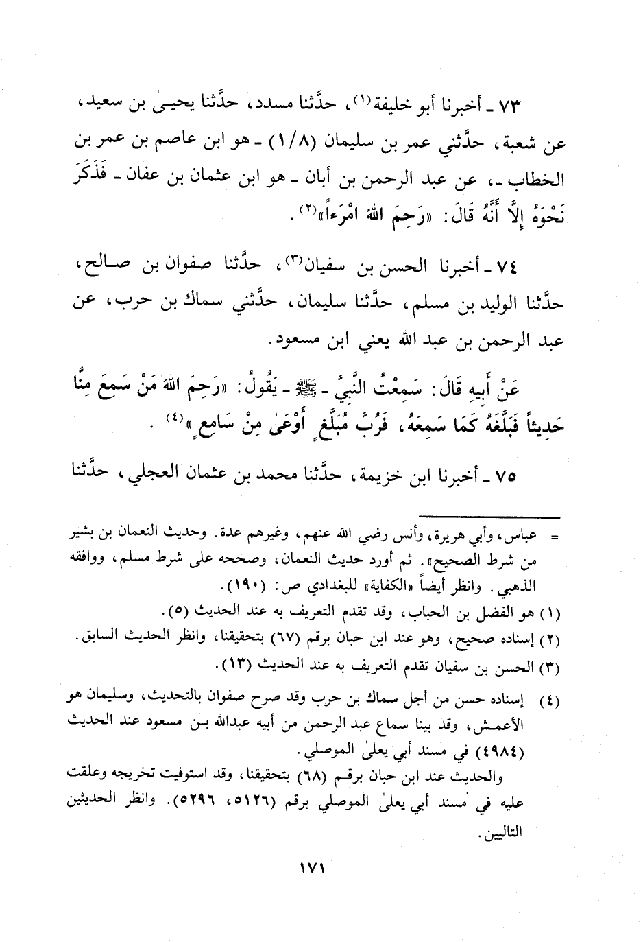 73 - أخبرنا أبو خليفة (¬1)، حدَّثنا مسدد، حدَثنا يحيى بن سعيد، عن شعبة، حدثنى عمر بن سليمان (8/ 1) - هو ابن عاصم بن عمر بن الخطاب-، عن عبد الرحمن بن أبان- هو ابن عثمان بن عفان- فَذَكَرَ نَحْوَهُ إِلاَّ أنَّهُ قَالَ: "رَحِمَ الله امْرَءاً" (¬2).