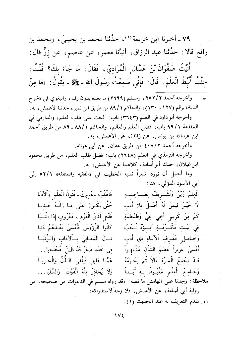وأخرجه الترمذي في العلم (2648) باب: فضل طلب العلم، من طريق محمود ابن غيلان، حدثنا أبو أسامة، كلاهما عن الأعمش، به. وما أجمل أن نورد شعراً نسبه الخطيب في "الفقيه والمتفقه" 1/ 52 إلى أبي الأسود الدؤلي، هنا: