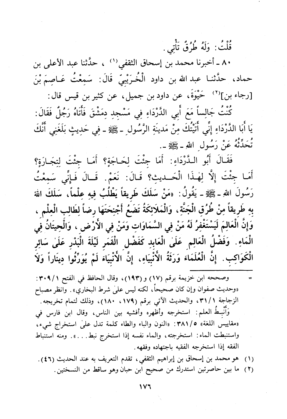 يَا أبا الدَّرْدَاءِ إِنَي أتَيْتُكَ مِنْ مَدينَةِ الرَّسُولِ - صلى الله عليه وسلم -فِي حَدِيثٍ بَلَغَنِي أَنَّكَ تُحَدِّثُهُ عَنْ رَسُولِ اللهِ - صلى الله عليه وسلم -. فَقَالَ أَبُو الدَّرْدَاءِ: أَمَا جِئْتَ لِحَاجَةٍ؟ أَمَا جِئْتَ لِتِجَارَةٍ؟ أَمَا جِئْتَ إِلا لِهذَا الْحَديثِ؟ قَالَ: نَعَمْ. قَالَ فَإِنِّي سَمِعْتُ رَسُولَ اللهِ - صلى الله عليه وسلم - يَقُولُ: "مَنْ سَلَكَ طَرِيقاً يَطْلُبُ فِيهِ عِلْماً، سَلَكَ اللهُ بِهِ طَرِيقاً مِنْ طُرُقِ الْجَنَّةِ، وَالْمَلاَئِكَةُ تَضَعُ أَجْنِحَتَهَا رِضاً لِطَالِب الْعِلْمِ، وَإِن الْعَالِمَ لَيَسْتَغْفِرُ لَهُ مَنْ فِي السَّمَاوَاتِ وَمَنْ فِى الأرْضِ، وَالحِيتَانُ فِي الْمَاءِ. وَفَضْلُ الْعَالِمِ عَلَى الْعَابِدِ كَفَضْلِ الْقَمَرِ لَيْلَةَ الْبَدْرِ عَلَى سَائِرِ الْكَوَاكِبِ. إِنَّ الْعُلَمَاءَ وَرَثَةُ الأنْبِيَاءِ، إِنَّ الأنْبِيَاءَ لَمْ يُوَرِّثُوا دِينَاراً وَلاَ