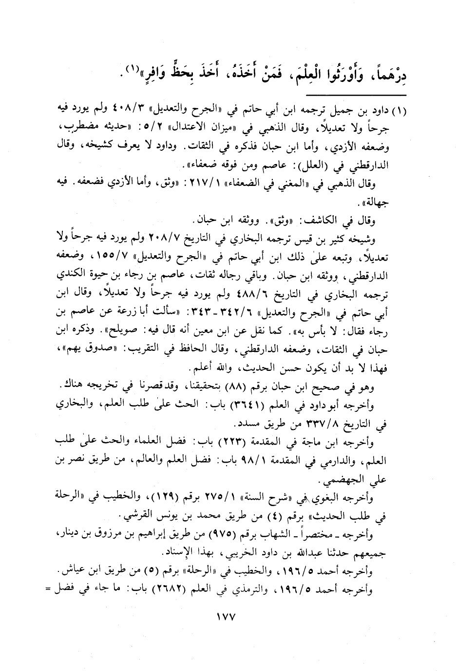 وأخرجه ابن ماجة في المقدمة (223) باب: فضل العلماء والحث على طلب العلم، والدارمي في المقدمة 1/ 98 باب: فضل العلم والعالم، من طريق نصر بن علي الجهضمي. وأخرجه البغوي في "شرح السنة" 1/ 275 برقم (129)، والخطيب في "الرحلة في طلب الحديث" برقم (4) من طريق محمد بن يونس القرشي.
