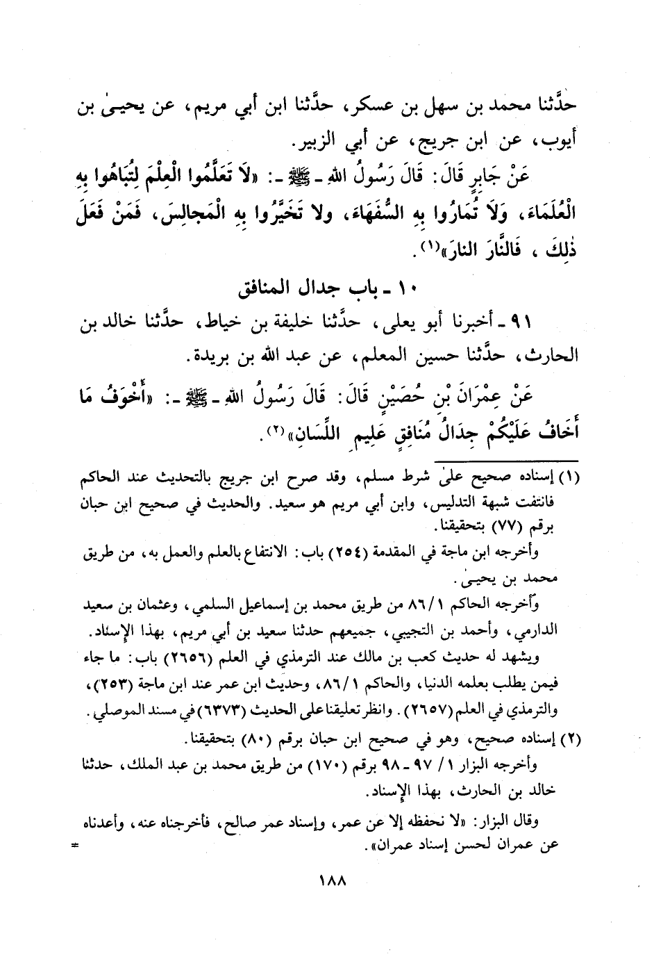 عَنْ عِمْرَانَ بْنِ حُصَيْنٍ قَالَ: قَالَ رَسُولُ اللهِ - صلى الله عليه وسلم -: "أخْوَفُ مَا أخَافُ عَلَيْكُمْ جِدَالُ مُنَافِقٍ عَلِيمِ اللَّسَانِ" (¬2).
