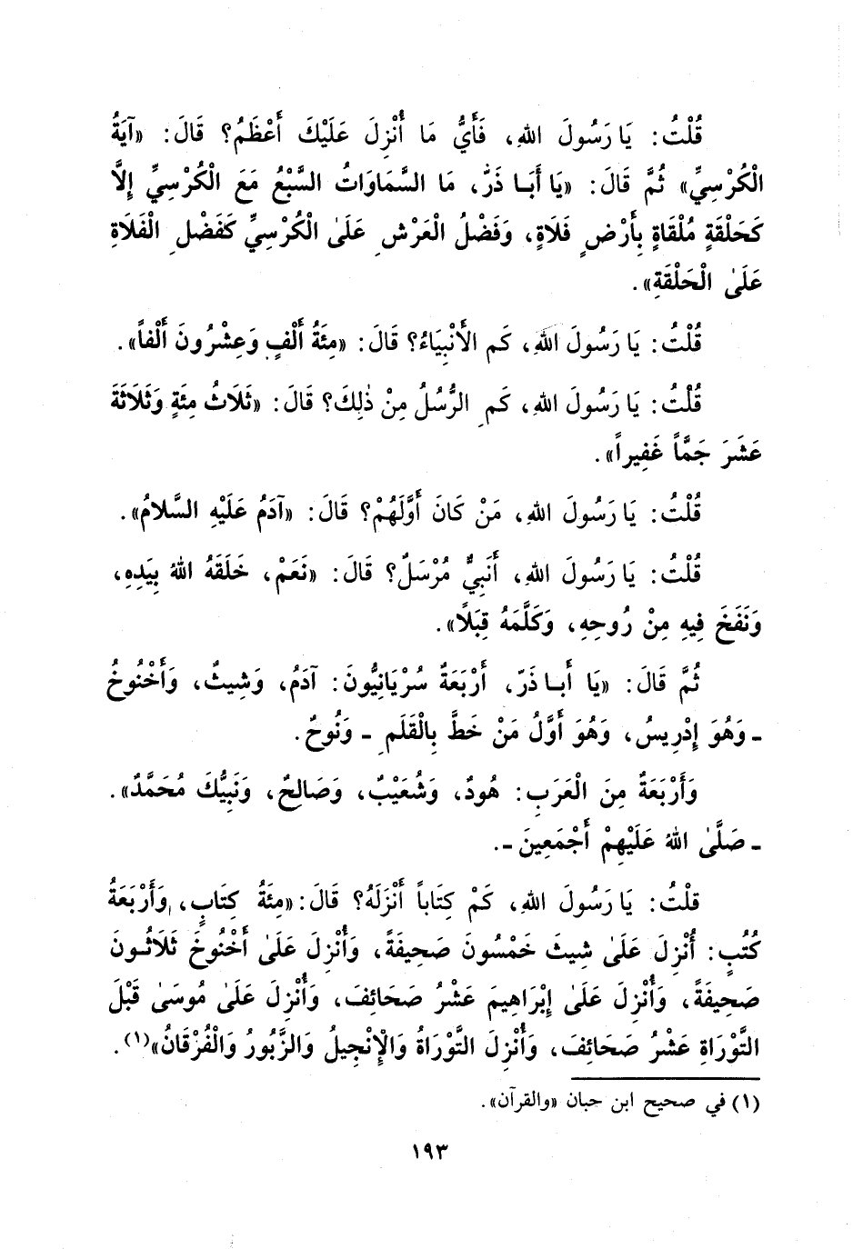 قُلْتُ: يَا رَسُولَ الله، فَأيُّ مَا أُنْزِلَ عَلَيْكَ أعْظَمُ؟ قَالَ: "آيَةُ الْكُرْسِيِّ " ثُمَّ قَالَ:" يَا أَبَا ذَرّ، مَا السَّماواتُ السَّبْعُ مَعَ الْكُرْسِيِّ إِلاَّ كَحَلْقَةٍ مُلْقَاةٍ بِأرْضٍ فَلاةٍ، وَفَضْلُ الْعَرْشِ عَلَى الْكُرْسِيِّ كفضل الْفَلاَةِ عَلَى الْحَلْقَةِ". قُلْتُ: يَا رَسُولَ اللهِ، كَم الأنْبِيَاءُ؟ قَالَ: "مِئَةُ أفْيٍ وَعِشْرُ ونَ ألْفأ". قُلتُ: يَا رَسُولَ الله، كَمِ الرسُلُ مِنْ ذلِكَ؟ قَالَ: "ثَلاثُ مِئَةٍ وَثَلاَثَةَ عَشَرَ جَمَّاً غفِيراً". قُلْتُ: يَا رَسُولَ اللهِ، مَنْ كَانَ أوَّلَهُمْ؟ قَالَ: "آدَمُ عَلَيْهِ السَّلامُ". قُلْتُ: يَا رَسُولَ الله، أَنَبِيٌّ مُرْسَلٌ؟ قَالَ: "نَعَمْ، خَلَقَهُ اللهُ بِيَدِهِ، وَنَفَخَ فِيهِ مِنْ رُوحِهِ، وَكَلَّمَهُ قِبَلاً". ثُمَّ قَالَ: "يَا أبا ذَرّ، أرْبَعَةٌ سُرْيَانِيُّونَ: آدَمُ، وَشِيث، وَأخْنُوخُ - وَهُوَ إِدْرِيسُ، وَهُوَ أوَّلُ مَنْ خَطَّ بِالْقَلَمِ- وَنُوحٌ. وَأَرْبَعَةٌ مِنَ الْعَرَبِ: هُودٌ، وَشُعَيْبٌ، وَصَالح، وَنَبِيُّكَ مُحَمَّدٌ". - صَلَّى الله عَلَيْهِمْ أجْمَعِينَ-. قلْتُ: يَا رَسُولَ الله، كَمْ كِتَاباً أنْزَلَهُ؟ قَالَ: "مِئَةُ كِتَابٍ، وَأَرْبَعَةُ كُتُبٍ: أُنْزِلَ عَلَى شِيثَ خَمْسُونَ صَحِيفَةً، وَأُنْزِلَ عَلَى أخْنُوخَ ثَلاثُونَ صَحِيفَةً، وَأُنْزِلَ عَلَى إِبْرَاهِيمَ عَشْرُ صَحَائِفَ، وَأُنْزِلَ عَلَى مُوسَى قَبْلَ التَّوْرَاةِ عَشْرُ صَحَائِفَ، وَأُنْزِلَ التَّوْرَاةُ وَالإنْجِيلُ وَالزَّبُورُ وَالْفُرْقَانُ" (¬1).