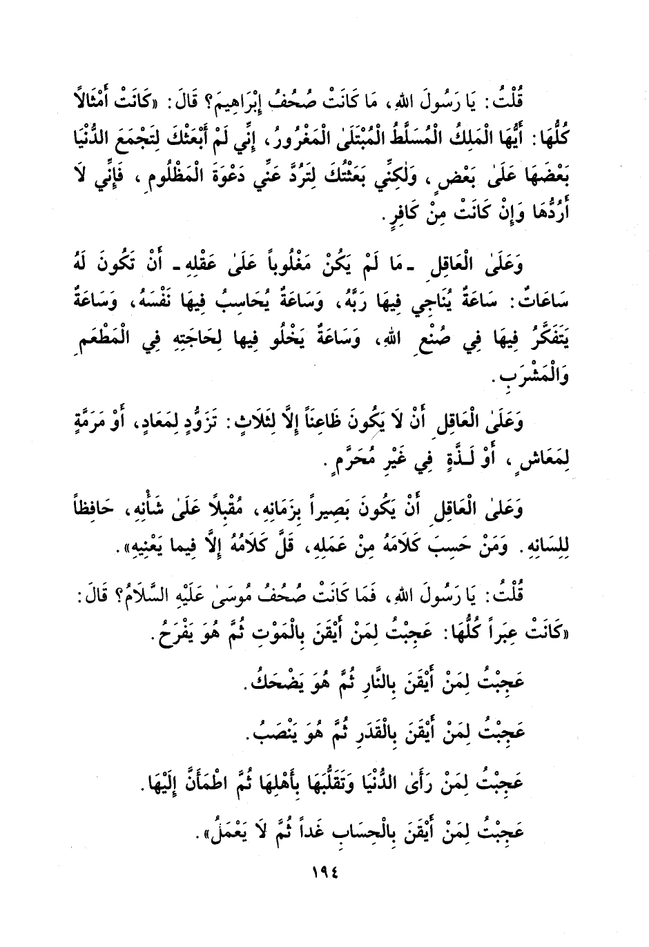 قُلْتُ: يَا رَسُولَ اللهِ، مَا كَانَتْ صُحُفُ إِبْرَاهِيمَ؟ قَالَ: "كَانتْ أمْثَالا كُلُّهَا: أيهَا الْمَلِكُ الْمُسَلَّطُ الْمُبْتَلَى الْمَغْرُورُ، إِنِّي لَمْ أَبْعَثْكَ لِتَجْمَعَ الدُّنْيَا بَعْضَهَا عَلَى بَعْض، وَلكِنِّي بَعَثْتُكَ لِتَرُدَّ عَنِّي دَعْوَةَ الْمَظْلُومِ، فَإِني لاَ أرُدُّهَا وَإِنْ كَانَتْ مِنْ كَافِرٍ. وَعَلَى الْعَاقِلِ- مَا لَمْ يَكُنْ مَغْلُوباً عَلَى عَقْلِهِ- أنْ تَكُونَ لَهُ سَاعَاتٌ: سَاعَةٌ يُنَاجِي فِيهَا رَبَّهُ، وَسَاعَةٌ يُحَاسِبُ فِيهَا نَفْسَهُ، وَسَاعَةٌ يَتَفَكَّرُ فِيهَا فِي صُنْعِ اللهِ، وَسَاعَةٌ يَخْلُو فِيها لِحَاجَتِهِ فِي الْمَطْعَم وَالْمَشْرَبِ. وَعَلَى الْعَاقِلِ أنْ لاَ لَكونَ ظَاعِنَاً إِلاَّ لِثَلَاثٍ: تَزَوُّدٍ لِمَعَادٍ، أوْ مَرَمَّةٍ لِمَعَاشٍ، أوْ لَذَّةٍ فِي غَيْرِ مُحَرَّمٍ. وَعَلى الْعَاقِلِ أنْ يَكُونَ بَصِيراً بِزَمَانِهِ، مُقْبِلاً عَلَى شَأْنِهِ، حَافِظاً لِلِسَانِهِ. وَمَنْ حَسِبَ كَلاَمَهُ مِنْ عَمَلِهِ، قَلَّ كَلاَمُهُ إِلاَّ فِيما يَعْنِيهِ". قُلْتُ: يَا رَسُولَ اللهِ، فَمَا كَانَتْ صُحُفُ مُوسَى عَلَيْهِ السلام؟ قَالَ: "كَانَتْ عِبَراً كُلُّهَا: عَجِبْتُ لِمَنْ أيْقَنَ بِالْمَوْتِ ثُمّ هُوَ يَفْرَحُ. عَجِبْتُ لِمَنْ أيْقَنَ بِالنَّارِ ثُمَّ هُوَ يَضْحَكُ. عَجِبْتُ لِمَنْ أيْقَنَ بِالْقَدَرِ ثُمّ هُوَ يَنْصَبُ. عَجِبْتُ لِمَنْ رَأَى الدُّنْيَا وَتَقَلُّبَهَا بِأَهْلِهَا ثُمّ اطْمَأَن إِلَيْهَا. عَجِبْتُ لِمَنْ أيْقَنَ بِالْحِسَابِ غدا ثم-لا يَعْمَل".