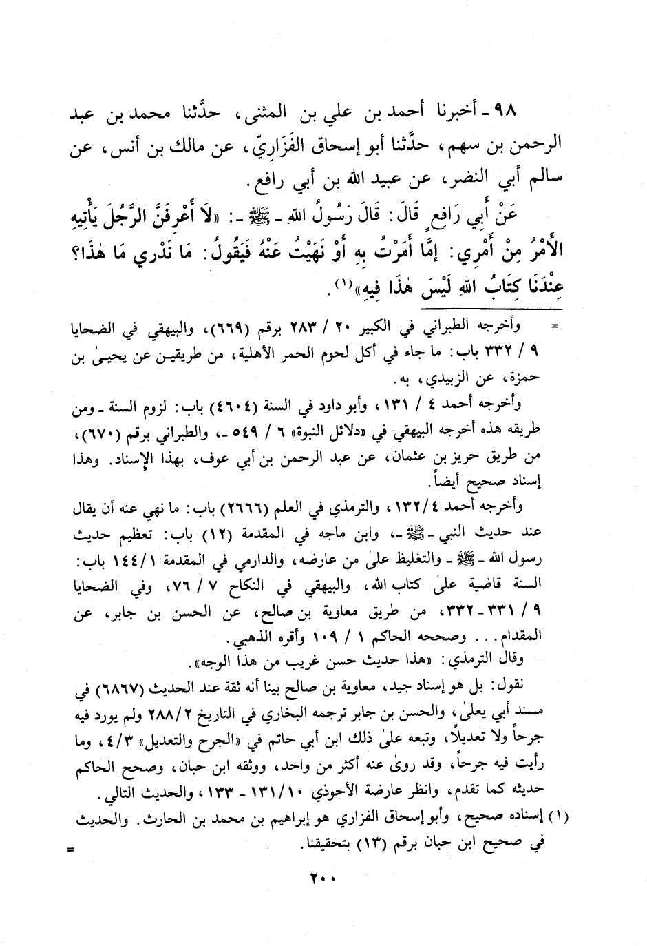عَنْ أبِي رَافعٍ قَالَ: قَالَ رَسُولُ اللهِ- صلى الله عليه وسلم -: "لا اعرِفَنَّ الرَّجُلَ يَأْتِيهِ الأمْرُ مِنْ أَمْرِي: إمَّا أمَرْتُ بِهِ أوْ نَهَيْتُ عَنْهُ فَيَقُولُ: مَا نَدْري مَا هذَا؟ عِنْدَنَا كِتَابُ اللهِ لَيْسَ هذَا فِيهِ" (¬1).