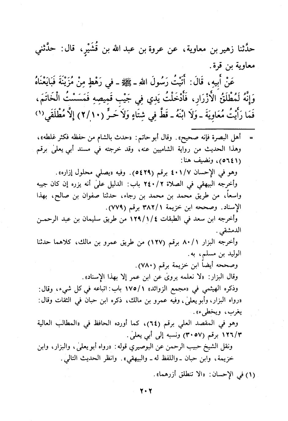 = أهل البصرة فإنه صحيح". وقال أبو حاتم: "حدث بالشام من حفظه فأكثر غلطه"، وهذا الحديث من رواية الشاميين عنه، وقد خرجته في مسند أبي يعلى برقم (5641)، ونضيف هنا: وهو في الإِحسان 7/ 401 برقم (5429). وفيه "يصلي محلول إزاره".