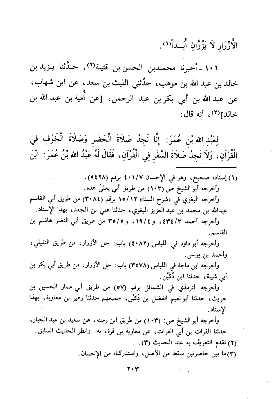 لِعَبْدِ اللهِ بْنِ عُمَرَ: إِنَّا نَجِدُ صَلَاةَ الْحَضَرِ وَصَلَاةَ الْخَوْفِ فِي الْقُرْآنِ، وَلا نَجِدُ صَلاَةَ السَّفَرِ فِي الْقُرْآنِ، فَقَالَ لَهُ عَبْدُ اللهِ بْنُ عُمَرَ: ابْنَ