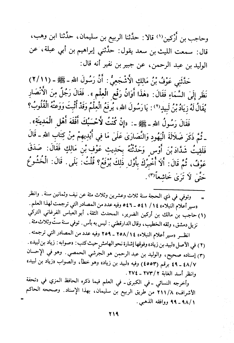 حَدَّثَنِي عَوْفُ بْنُ مَالِكٍ الأشْجَعِي: أَنَّ رَسُولَ اللهِ - صلى الله عليه وسلم - (11/ 2) نَظَر إِلَى السَّمَاءِ فَقَالَ: "هذَا أوَانُ رَفْعِ الْعِلْمِ". فَقَالَ رَجُلٌ مِنَ الأنْصَارِ يُقَالُ لَهُ زِيَادُ بْنُ لَبِيدٍ (¬2): يَا رَسُولَ اللهِ، يُرفَعُ الْعِلْمُ وَقَدْ أُثْبِتَ وَوَعتْهُ الْقُلُوبُ؟ فَقَالَ- رَسُولُ اللهِ - صلى الله عليه وسلم -: "إِنْ كنْتُ لأحْسَبُكَ أفْقَهَ أهْلِ الْمَدِينَةِ". - ثُمَّ ذَكَرَ ضَلالَةَ الْيَهُودِ وَالنَّصَارَى عَلَى مَا فِي أيْدِيهِمْ مِنْ كِتاب اللهِ- قَالَ فَلَقِيتُ شَدَّادَ بْنَ أوْسٍ وَحَدَّثْتُهُ بحَدِيثِ عَوْفِ بْنِ مَالِكٍ فَقَاَلَ: صَدَقَ عَوْفٌ، ثُمَّ قَالَ: ألا أُخْبِرُكَ بِأوَّلِ ذَلِكَ يُرْفَعُ؟ قُلْتُ: بَلَى. قَالَ: الْخشُوعُ حَتَّى لا تَرَى خَاشِعاً (¬3).
