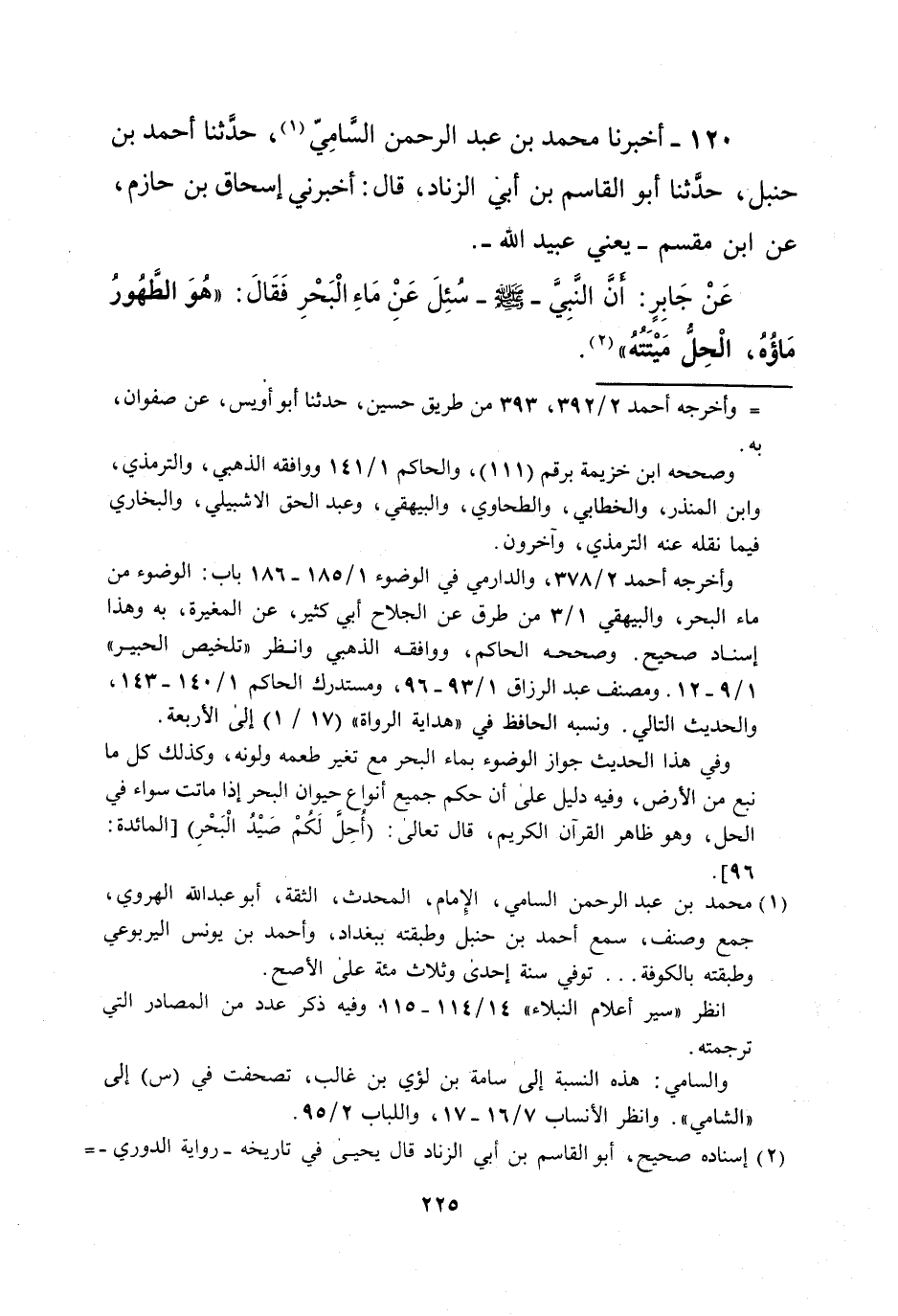عَنْ جَابِرٍ: أنَّ النَّبِيَّ - صلى الله عليه وسلم - سُئِلَ عَن مَاءِ الْبَحْرِ فَقَالَ: "هُوَ الطَّهُورُ مَاؤُهُ، الْحِلُّ مَيْتَتُهُ" (¬2).