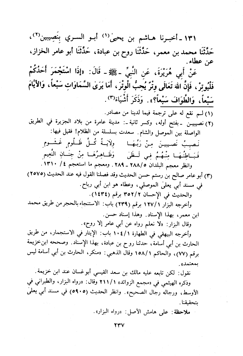 131 - أخبرنا هاشم بن يحيى (¬1) أبو السري بِنَصِيبين (¬2)، حَدَّثَنَا محمد بن معمر، حَدَّثَنَا روح بن عبادة، حَدَّثَنَا أبو عامر الخزاز، عن عطاء.