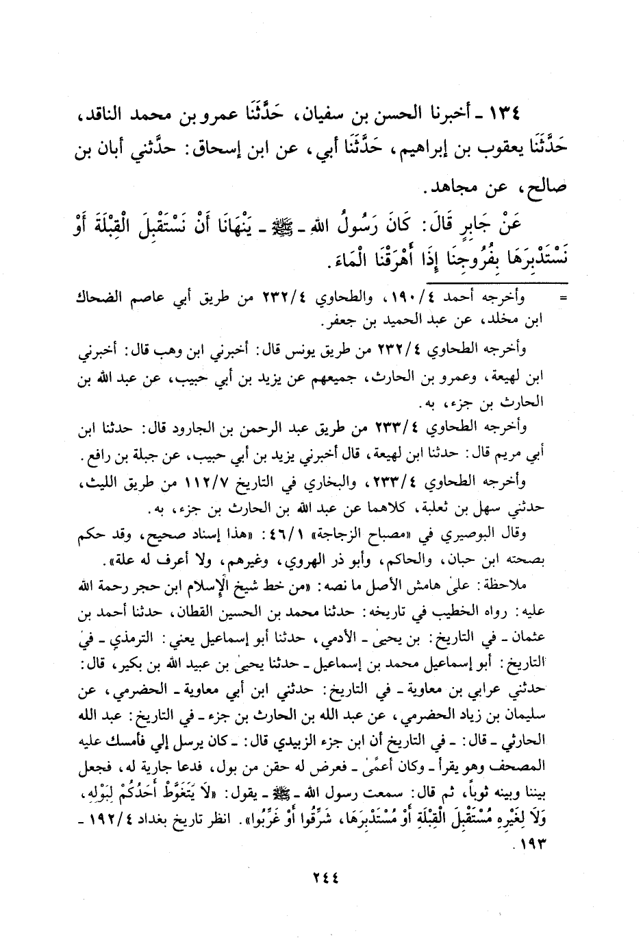ملاحظة: على هامش الأصل ما نصه: " من خط شيخ الإسلام ابن حجر رحمة الله عليه: رواه الخطيب في تاريخه: حدثنا محمد بن الحسين القطان، حدثنا أحمد بن عثمان- في التاريخ: بن يحيى- الأدمي، حدثنا أبو إسماعيل يعني: الترمذي- في ْالتاريخ: أبو إسماعيل محمد بن إسماعيل- حدثنا يحيى بن عبيد الله بن بكير، قال: حدثني عرابي بن معاوية- في التاريخ: حدثني ابن أبي معاوية- الحضرمي، عن سليمان بن زياد الحضرمي، عن عبد الله بن الحارث بن جزء- في التاريخ: عبد الله الحارثي- قال:- في التاريخ أن ابن جزء الزبيدي قال:- كان يرسل إلي فأمسك عليه المصحف وهو يقرأ- وكان أعمى- فعرض له حقن من بول، فدعا جارية له، فجعل بيننا وبينه ثوباً، ثم قال: سمعت رسول الله -صلى الله عليه وسلم -يقول: "لاَ يَتَغَوَّطْ أحَدُكُمْ لِبَوْلِهِ، وَلا لِغَيْرِهِ مُسْتَقْبِلَ الْقِبْلَةِ أو مسْتَدْبِرَهَا، شَرِّقُوا أو غَرِّبُوا". انظر تاريخ بغداد 4/ 192 - 193.