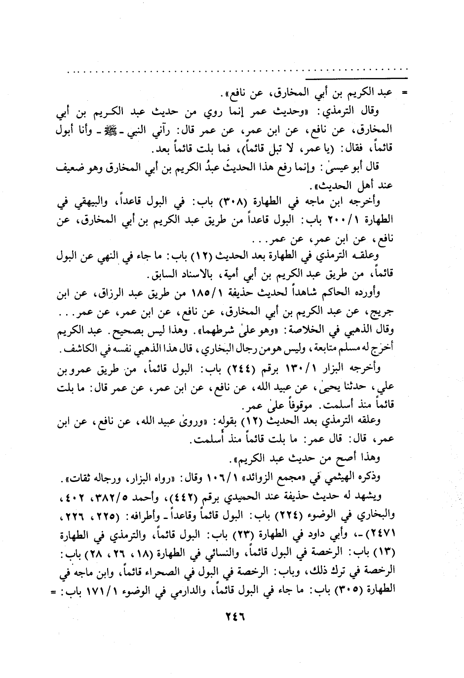 = عبد الكريم بن أبي المخارق، عن نافع". وقال الترمذي: "وحديث عمر إنما روي من حديث عبد الكريم بن أبي المخارق، عن نافع، عن ابن عمر، عن عمر قال: رآني النبي - صلى الله عليه وسلم - وأنا أبول قائماً، فقال: (يا عمر، لا تبل قائماً)، فما بلت قائماً بعد.