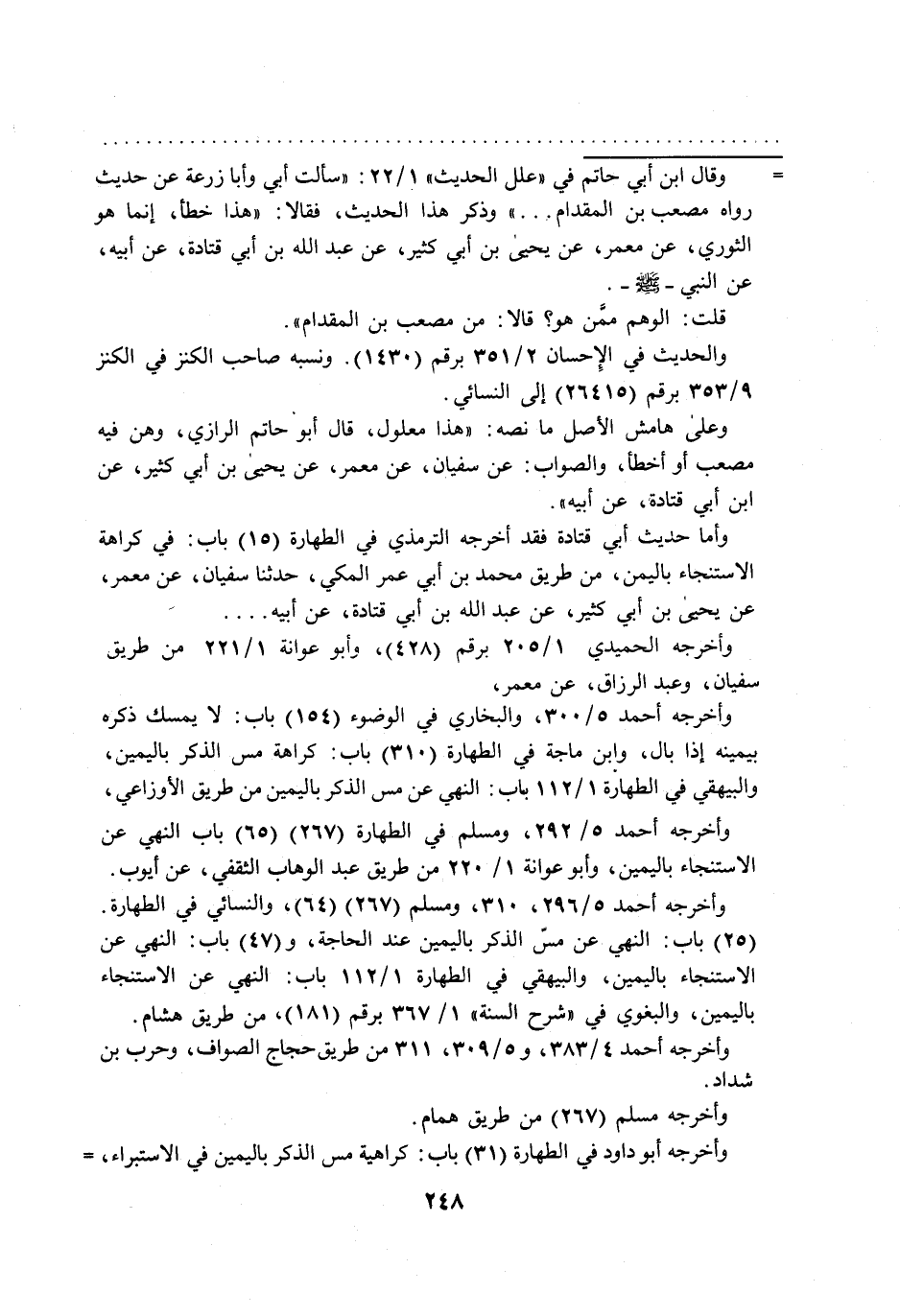 وعلى هامش الأصل ما نصه: "هذا معلول، قال أبو حاتم الرازي، وهن فيه مصعب أو أخطأ، والصواب: عن سفيان، عن معمر، عن يحيى بن أبي كثير، عن ابن أبي قتادة، عن أبيه".