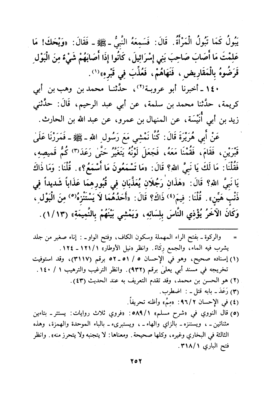 عَنْ أبِي هُرَيْرَةَ قَالَ: كُنَّا نَمْشِي مَعَ رَسُولِ اللهِ - صلى الله عليه وسلم - فَمَرَرْنَا عَلَى قَبْرَيْنِ، فَقَامَ، فَقُمْنَا مَعَهُ، فَجَعَلَ لَوْنُهُ يَتَغَيَّرُ حَتَّى رَعَدَ (¬3) كُمُّ قَميصِهِ، فَقُلْنَا: مَا لَكَ يَا نَبِيَّ الله؟ قَالَ: "مَا تَسْمَعُونَ مَا أَسْمَعُ؟ ". قُلْنَا: وَمَا ذاكَ يَا نَبِيَّ اللهِ؟ قَالَ: "هذَانِ رَجُلانِ يُعَذَّبَانِ فِي قُبُورِهِمَا عَذَاباً شَديداً فِي ذَنْبٍ هَيِّنٍ". قُلْنَا: فِيمَ (¬4) ذَاكَ؟ قَالَ: "أَحَدُهُمَا لا يَسْتَنْزِهُ (¬5) مِنَ الْبَوْلِ، وَكَانَ الآخَرُ يُؤْذِي النَّاسَ بِلِسَانِهِ، وَيَمْشِي بَيْنَهُمْ بِالنَّمِيمَةِ" (13/ 1).