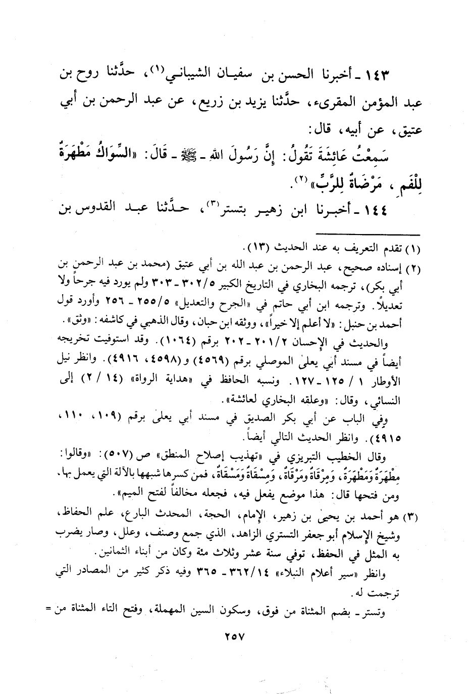 143 - أخبرنا الحسن بن سفيان الشيباني (¬1)، حدَّثنا روح بن عبد المؤمن المقرئ، حدَّثنا يزيد بن زريع، عن عبد الرحمن بن أبي عتيق، عن أبيه، قال: