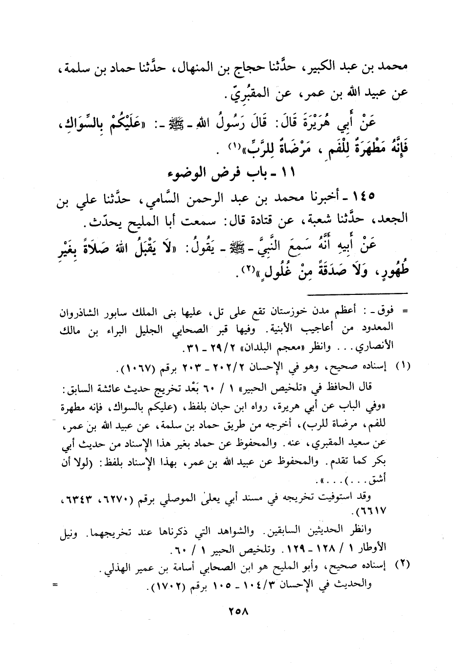 (¬1) إسناده صحيح، وهو في الإِحسان 2/ 202 - 203 برقم (1067). قال الحافظ في "تلخيص الحبير" 1/ 60 بَعْد تخريج حديث عائشة السابق: "وفي الباب عن أبي هريرة، رواه ابن حبان بلفظ، (عليكم بالسواك، فإنه مطهرة للفم، مرضاة للرب)، أخرجه من طريق حماد بن سلمة، عن عبيد الله بن عمر، عن سعيد المقبري، عنه. والمحفوظ عن حماد بغير هذا الإِسناد من حديث أبي بكر كما تقدم. والمحفوظ عن عبيد الله بن عمر، بهذا الإِسناد بلفظ: (لولا أن أشق ... ) ... ".