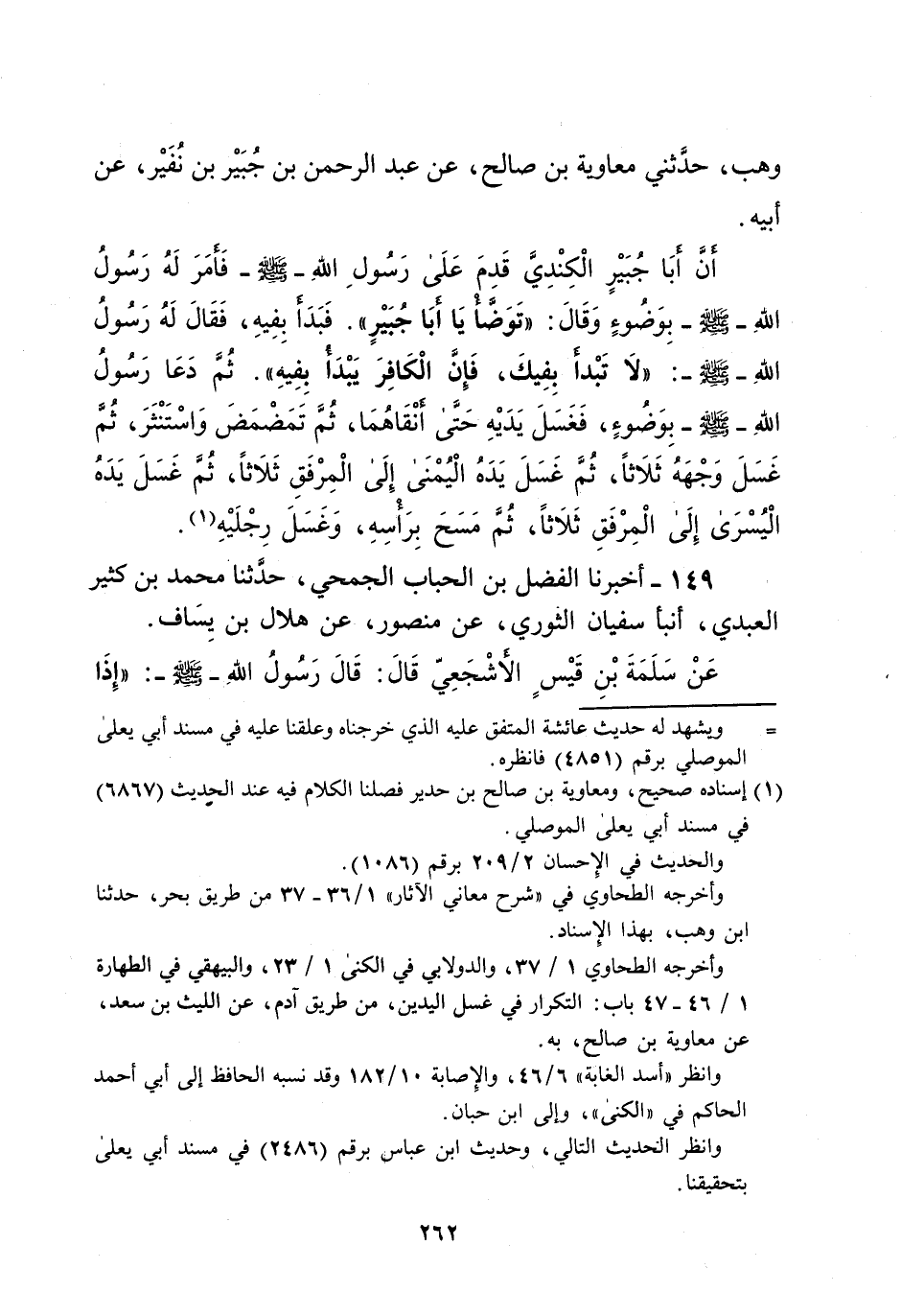 أَّنَّ أبَا جُبَيْرٍ الْكِنْدِيَّ قَدمَ عَلَى رَسُولِ اللهِ - صلى الله عليه وسلم - فَأمَرَ لَهُ رَسُولُ اللهِ - صلى الله عليه وسلم - بِوَضُوءٍ وَقَالَ: "تَوَضّأْ يَا أبَا جُبَيْرٍ". فَبَدَأ بِفِيهِ، فَقَالَ لَهُ رَسُولُ الله - صلى الله عليه وسلم -: "لا تَبْدأ بِفِيكَ، فَإِنَّ الْكَافِرَ يَبْدَأُ بِفِيةِ". ثُمَّ دَعَا رَسُولُ اللهِ - صلى الله عليه وسلم - بِوَضُوءٍ، فَغَسَلَ يَدَيْهِ حَتَّى أَنْقَاهُمَا، ثُمّ تَمَضْمَضَ وَاسْتَنْثَرَ، ثُمَّ غَسَلَ وَجْهَهُ ثَلاثاً، ثُمّ غَسَلَ يَدَهُ الْيُمْنَى إِلَى الْمِرْفَقِ ثَلاثاً، ثم غَسَلَ يَدَهُ الْيُسْرَى إِلَى الْمِرْفَقِ ثَلاَثاً، ثُمّ مَسَحَ بِرَأْسِهِ، وَغَسَلَ رِجْلَيْهِ (¬1).