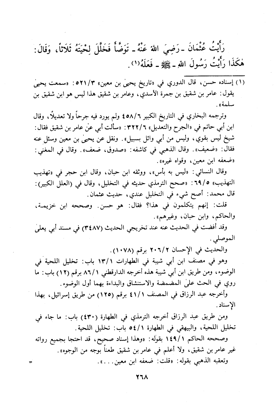 رَأَيْتُ عُثْمَانَ -رَضِيَ الله عَنْهُ- تَوَضَّأَ فَخَلَّلَ لِحْيَتَهُ ثَلاَثاً، وَقَالَ: هكَذَا رَأيْتُ رَسُولَ اللهِ - صلى الله عليه وسلم - فَعَلَهُ (¬1).