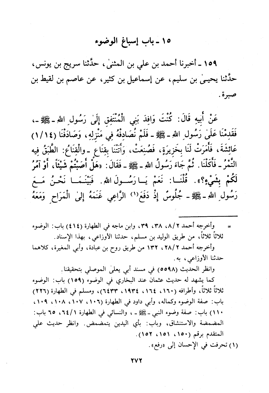 159 - أخبرنا أحمد بن علي بن المثنى، حدَّثنا سريج بن يونس، حدَّثنا يحيى بن سليم، عن إسماعيل بن كثير، عن عاصم بن لقيط بن صبرة.