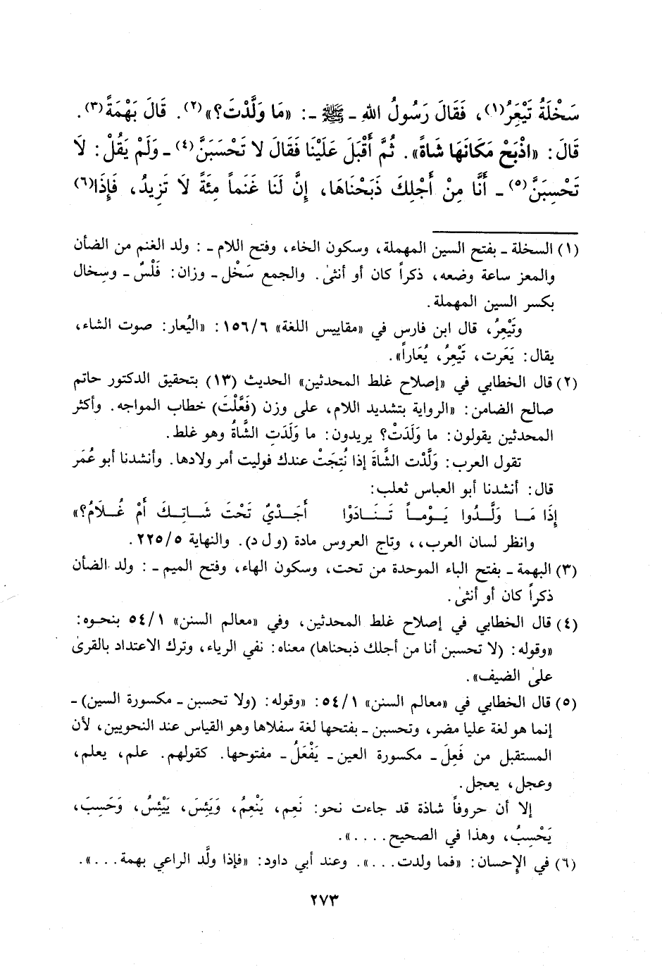 (¬2) قال الخطابي في "إصلاح غلط المحدثين" الحديث (13) بتحقيق الدكتور حاتم صالح الضامن: "الرواية بتشديد اللام، على وزن (فعَّلْتَ) خطاب المواجه. وأكثر المحدثين يقولون: ما وَلَدَتْ؟ يريدون: ما وَلَدَتِ الشَاةُ وهو غلط.