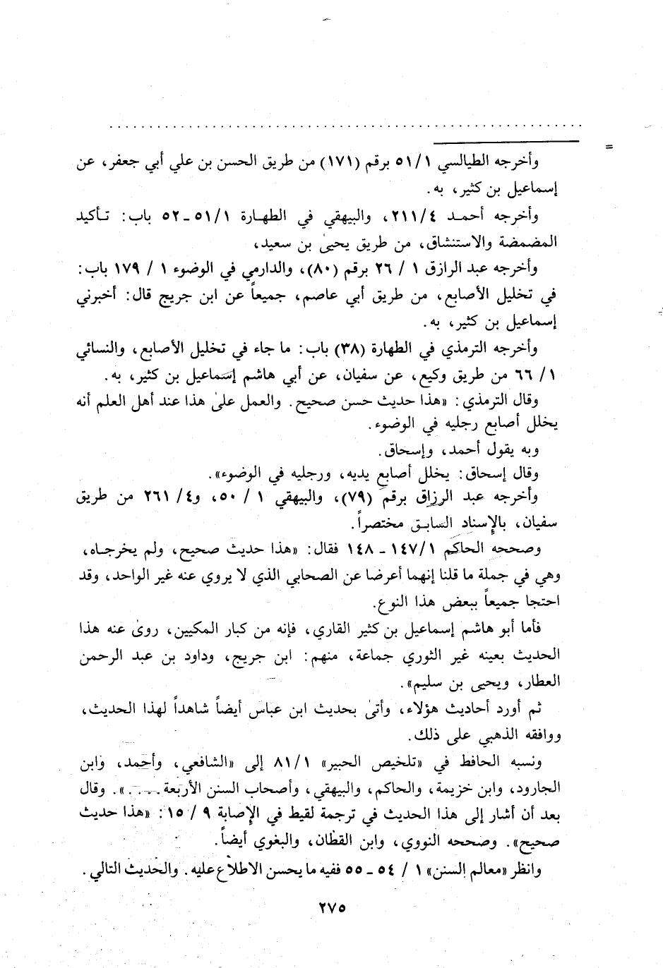 وأخرجه الترمذي في الطهارة (38) باب: ما جاء في تخليل الأصابع، والنسائي 1/ 66 من طريق وكيع، عن سفيان، عن أبي هاشم إسَماعيل بن كثير، به. وقال الترمذي: "هذا حديث حسن صحيح. والعمل على هذا عند أهل العلم أنه يخلل أصابع رجليه في الوضوء.